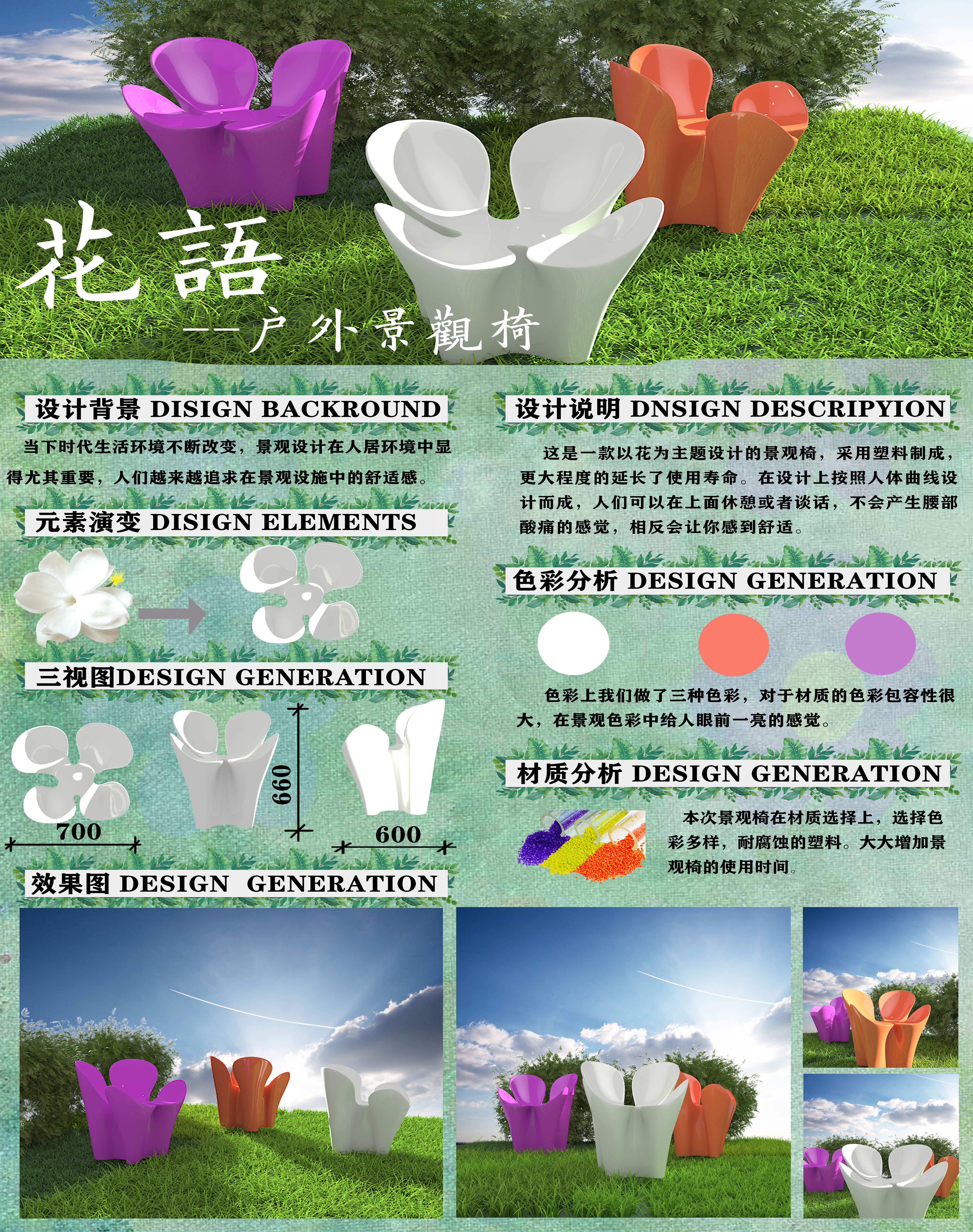 这是一款以花为主题设计的景观椅,采用塑料制成,更大程度的延长了使用寿命。在设计上按照人体曲线设计而成,人们可以,在上面休憩或者谈话,不会产生腰部酸痛的感觉,相反会让你感到舒适。