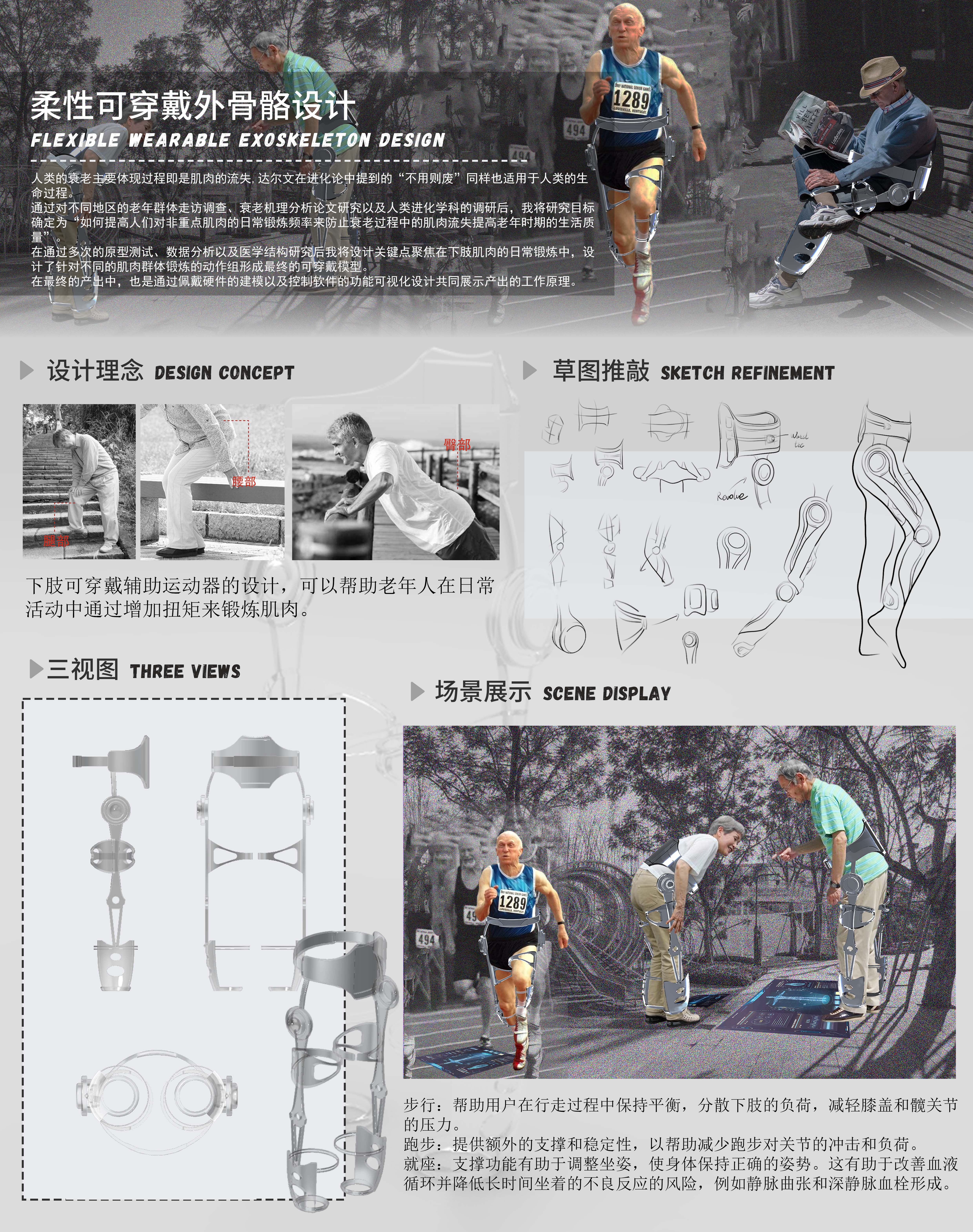 通过对不同地区的老年群体走访调查、衰老机理分析论文研究的调研后,我将研究目标确定为“如何提高人们对非重点肌肉的日常锻炼频率来防止衰老过程中的肌肉流失提高老年时期的生活质量”。在通过多次的原型测试、数据分析后我将设计关键点聚焦在下肢肌肉的日常锻炼中,设计了针对不同的肌肉群体锻炼的动作组形成最终的可穿戴模型。在最终的产出中,也是通过佩戴硬件的建模以及控制软件的功能可视化设计共同展示产出的工作原理。