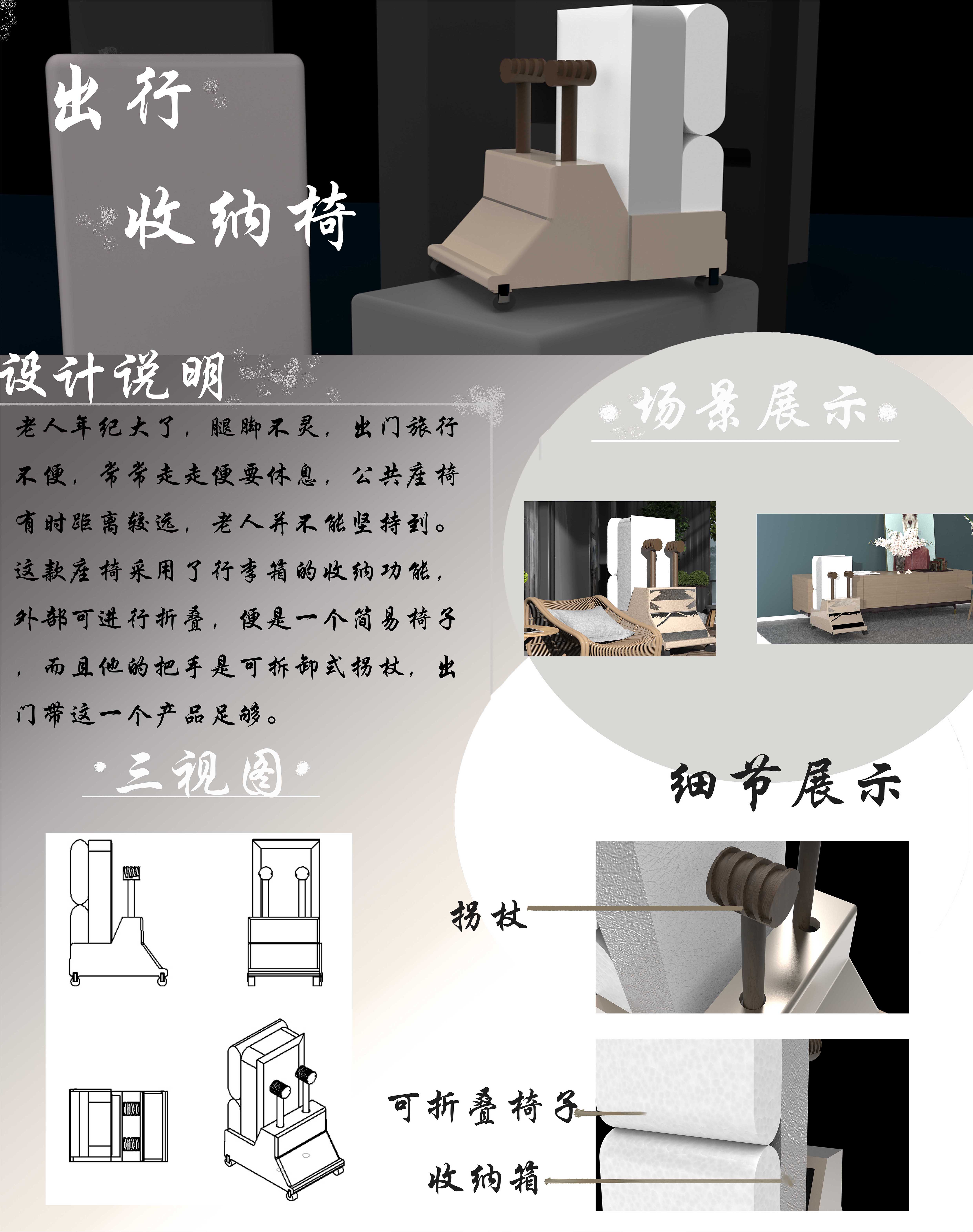 老人年纪大了,腿脚不灵,出门旅行不便,常常走走便要休息,公共座椅有时距离较远,老人并不能坚持到。这款座椅采用了行李箱的收纳功能,外部可进行折叠,便是一个简易椅子,而且他的把手是可拆卸式拐杖,出门带这一个产品足够。老人出门时可以直接将拐杖拿出,路上走累了可以在椅子上简单休息下。