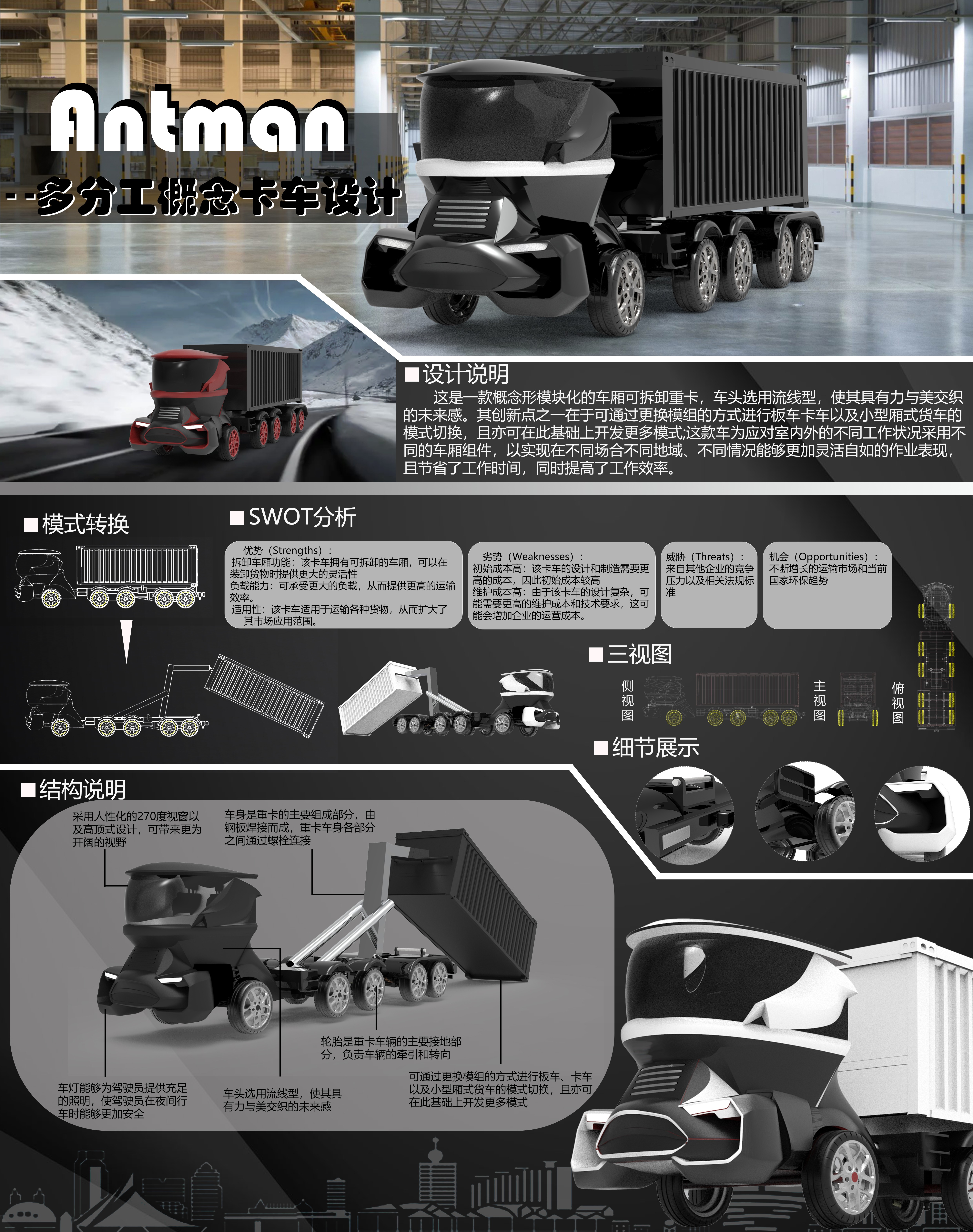 这是一款概念形模块化的车厢可拆卸重卡,车头选用流线型,使其具有力与美交织的未来感。其创新点之一在于可通过更换模组的方式进行板车卡车以及小型厢式货车的模式切换,目亦可在此基础上开发更多模式;这款车为应对室内外的不同工作状况采用不司的车厢组件,以实现在不同场合不同地域、不同情况能够更加灵活自如的作业表现且节省了工作时间,同时提高了工作效率。