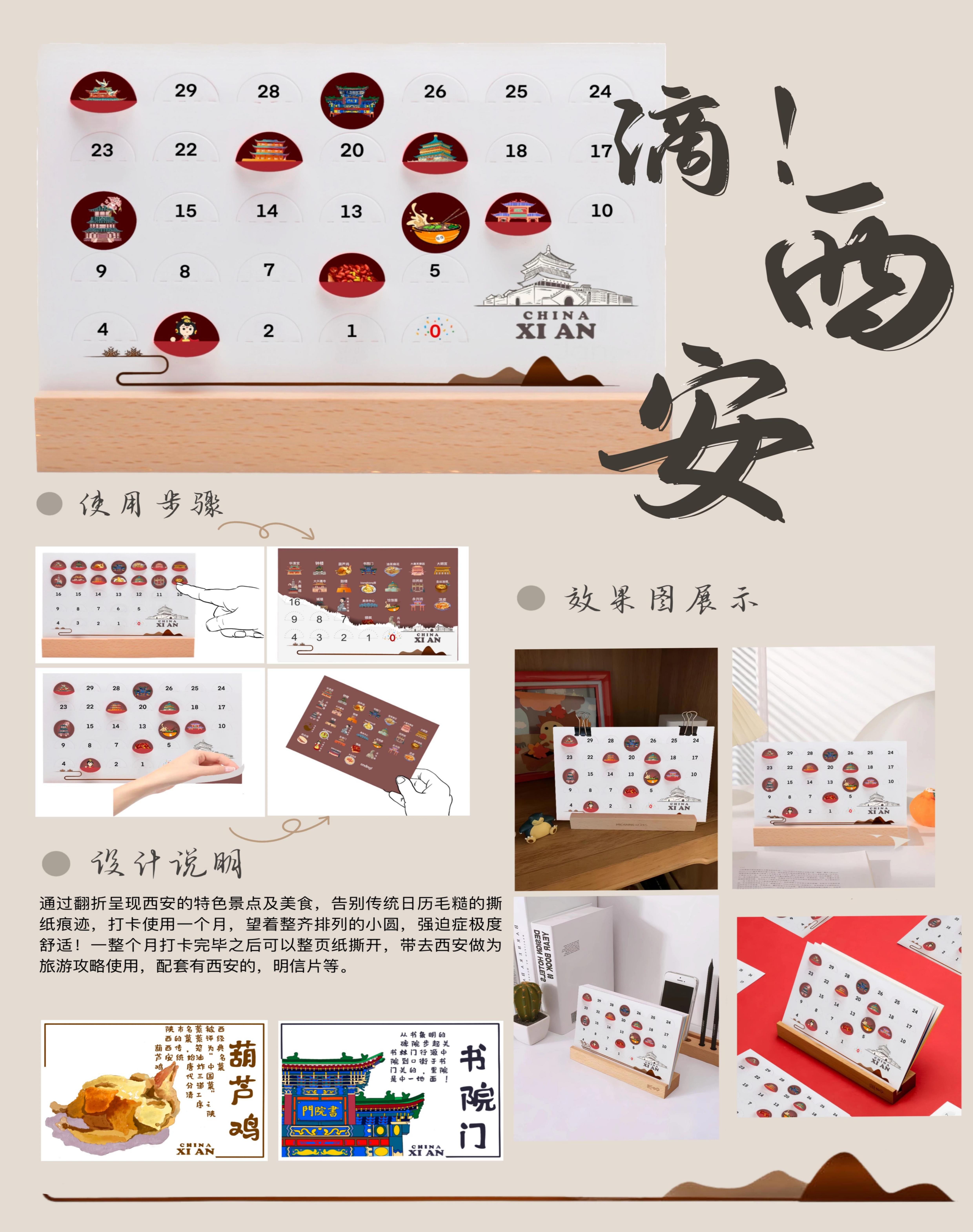 针对去西安旅游的用户设计。本产品针对此问题做出一款西安旅游的倒数日历。每张日历设有30个景点级美食的图片,根据每天的日期撕掉对应的日期,小圆圈后面有着精美的插画,其中包括西安的各种景点还有特色美食,每撕掉一天的日子,后面的景点及美食会逐一显现,打开试用一个月之后,望着整齐排列的小羊,强迫症极度舒适,一整个月打卡完毕之后可以将外面一整张的纸撕下,后面整张图片可以做为去西安旅游时使用的旅游攻略