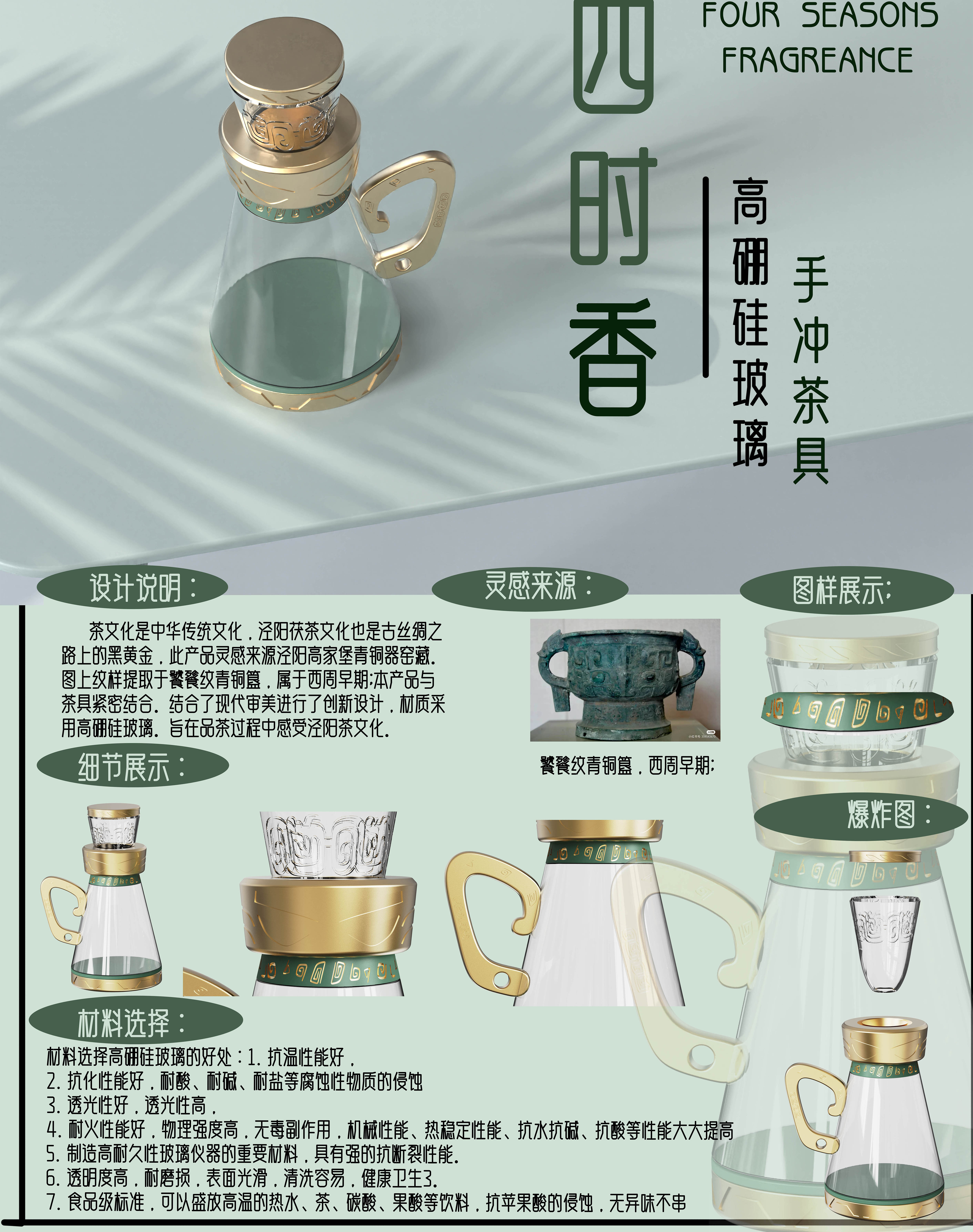 “四时香”的设计说明: 茶文化是中华传统文化,泾阳茯茶文化也是古丝绸之路上的黑黄金,此产品灵感来源泾阳高家堡青铜器窑藏。图上纹样提取于饕餮纹青铜簋,属于西周早期;本产品与茶具紧密结合。结合了现代审美进行了创新设计,材质采用高硼硅玻璃。旨在品茶过程中感受泾阳茶文化。