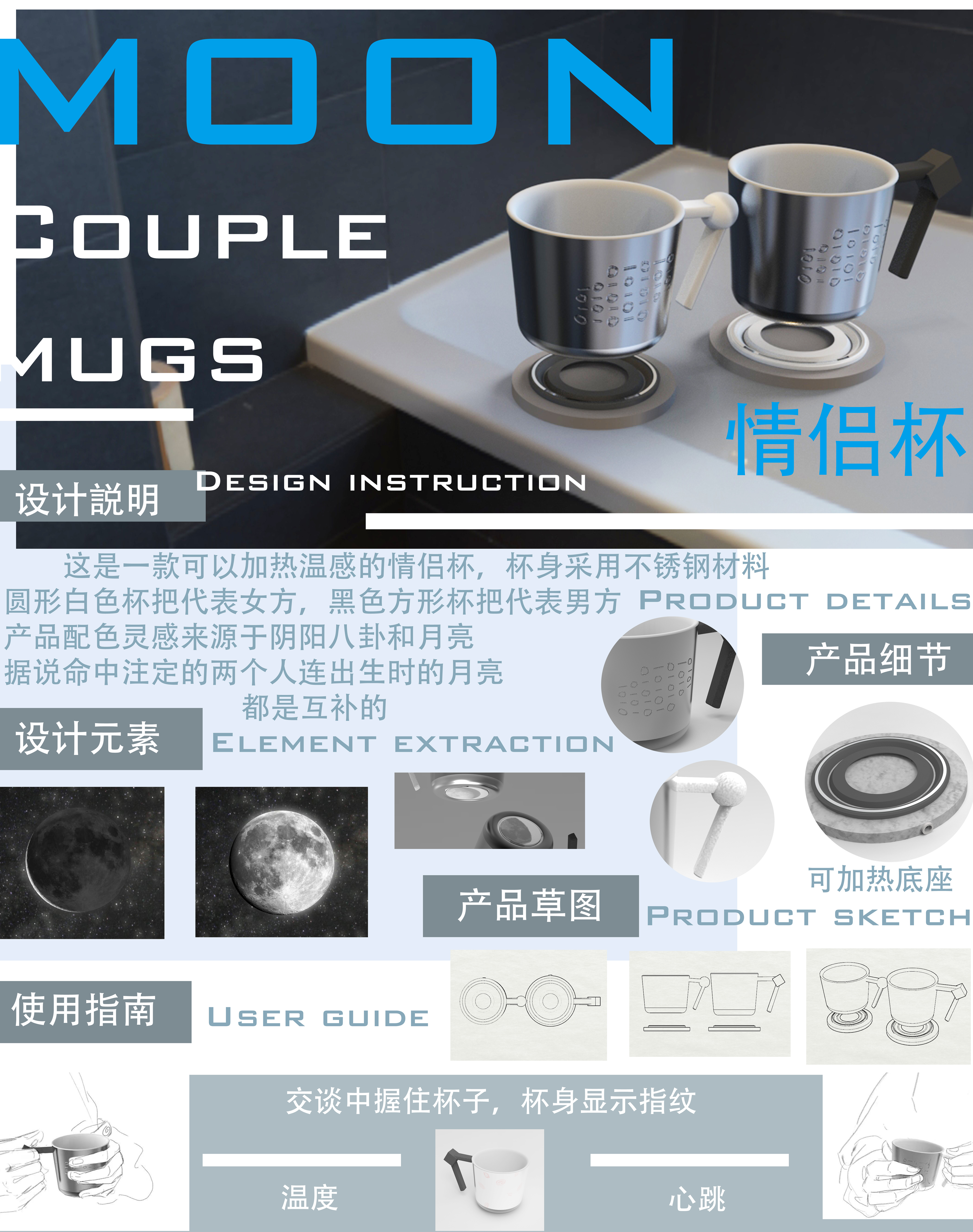这是一款可以加热温感的情侣杯,杯身采用不锈钢材料圆形白色杯把代表女方,黑色方形杯把代表男方 产品配色灵感来源于阴阳八卦和月亮据说命中注定的两个人连出生时的月亮产品细节都是互补的。