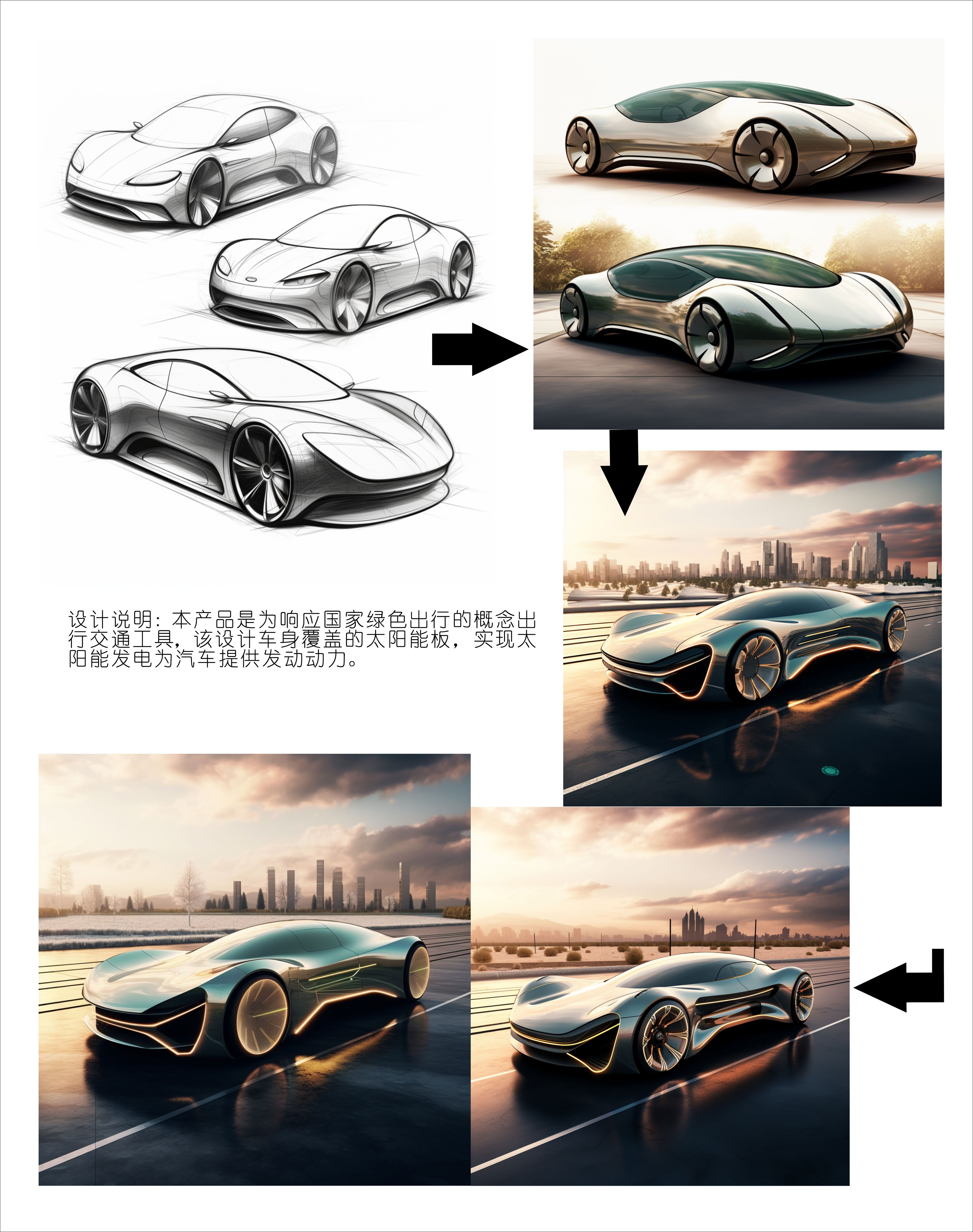 设计说明:本产品是为响应国家绿色出行的概念出行交通工具,该汽车流畅的车身体现的未来的科技感,车身上覆盖的太阳能发电板可持续的为车辆提供充分的动力,打破了传统机动汽车与新型电动汽车的局限性,为使用者减少了使用汽车过程中加油和充电所需花费的成本。