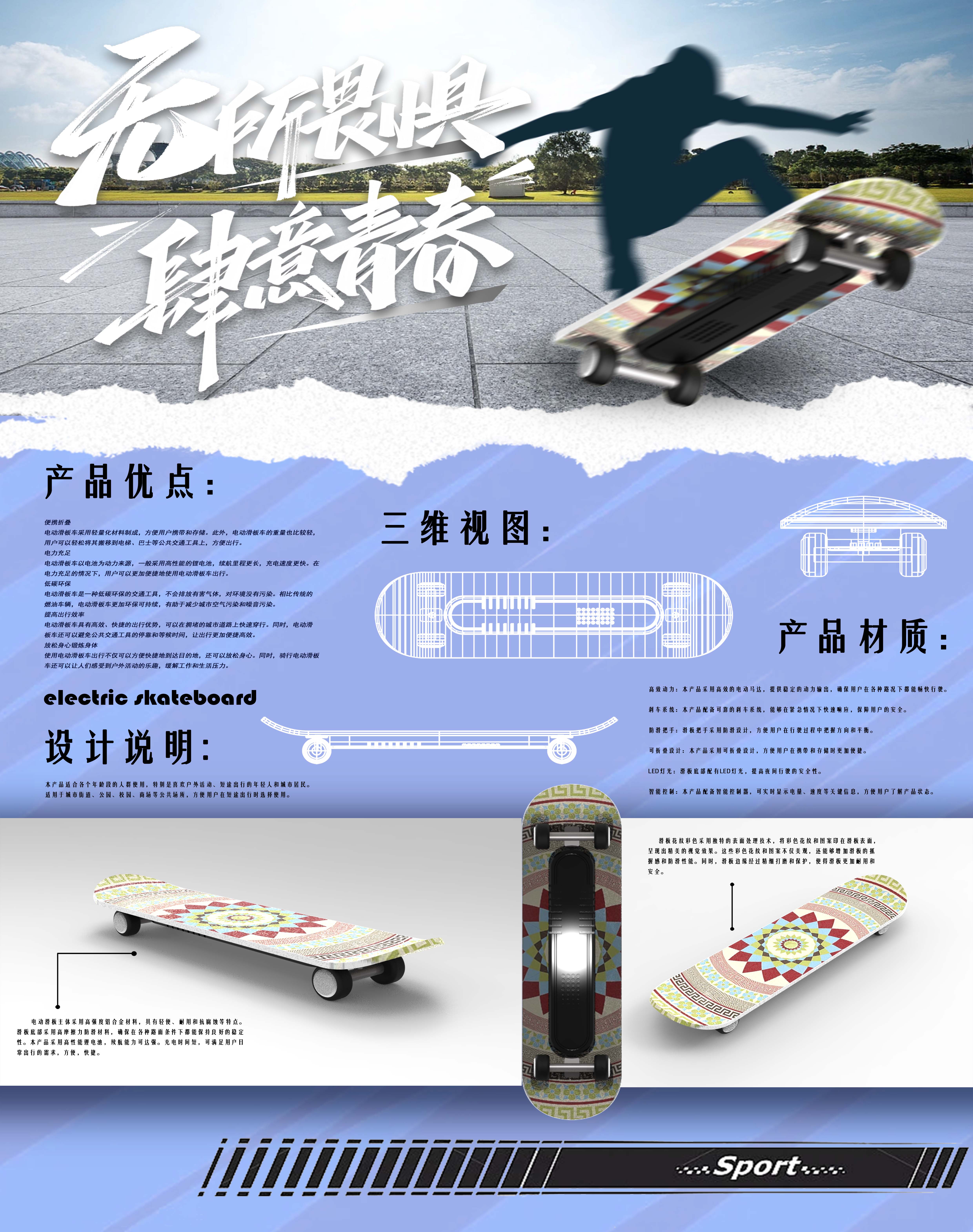 将滑板车加上电动装置,打造出轻便易携带的出行工具,体积小,无污染,方便出行且易上手,方便年轻人的出行,不受楼梯等障碍物的影响。