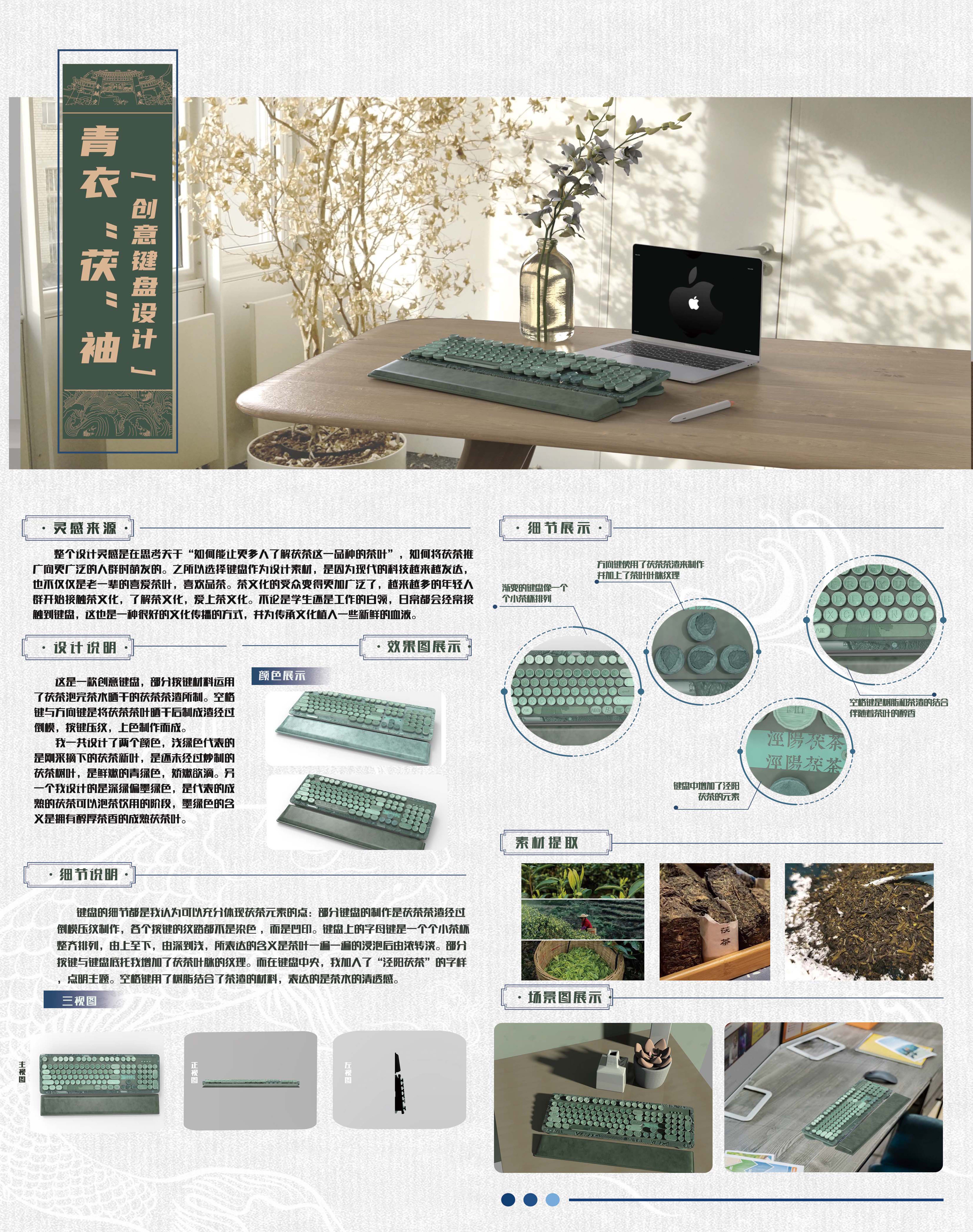 这是一款创意键盘,部分按键材料运用了茯茶泡完茶水晒干的茯茶茶渣所制。空格键与方向键是将茯茶茶叶晒干后制成渣经过倒模,按键压纹,上色制作而成。 我一共设计了两个颜色,浅绿色代表的是刚采摘下的茯茶新叶,是还未经过炒制的茯茶树叶,是鲜嫩的青绿色,娇嫩欲滴。另一个我设计的是深绿偏墨绿色,是代表的成熟的茯茶可以泡茶饮用的阶段,墨绿色的含义是拥有醇厚茶香的成熟茯茶叶。