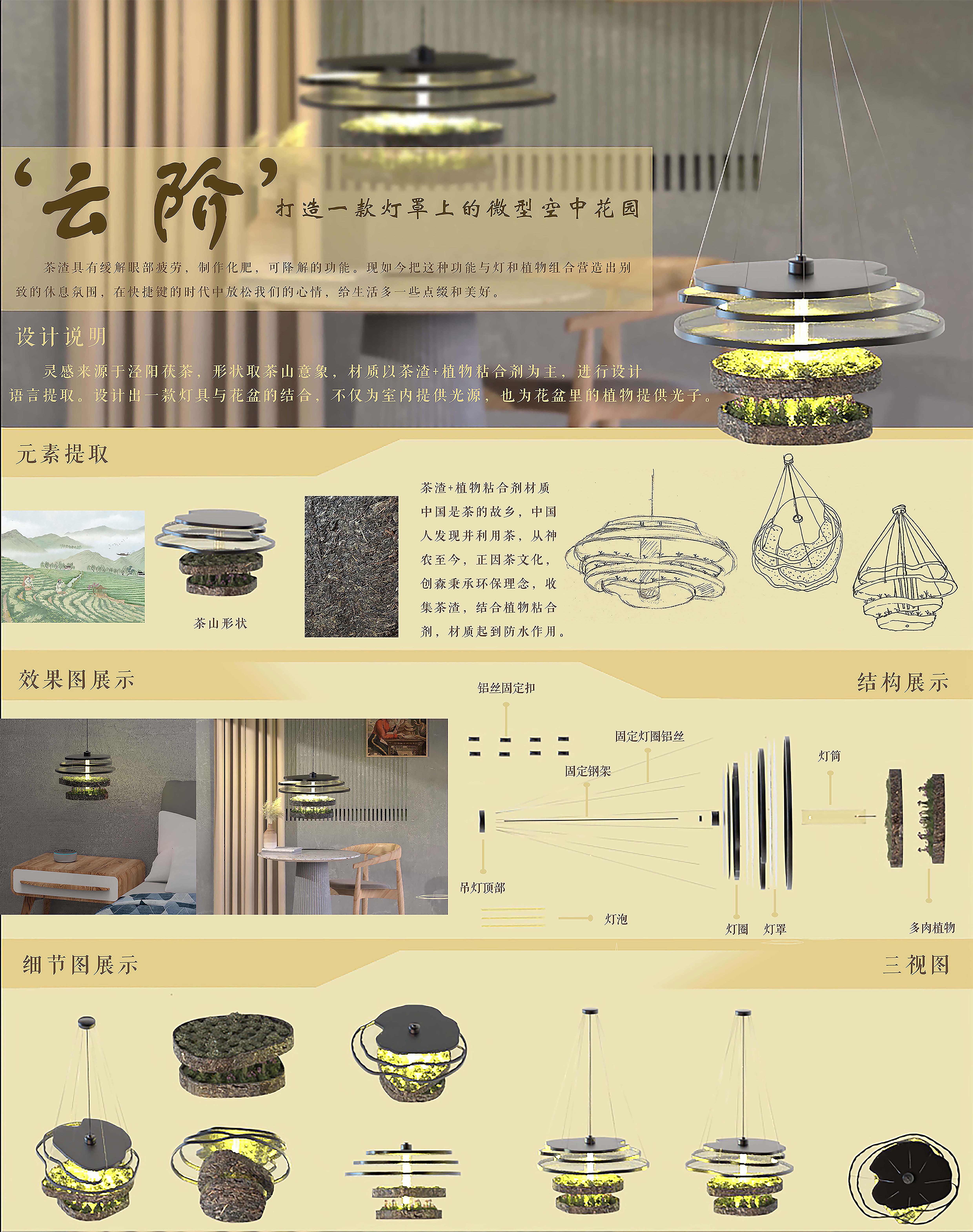 灵感来源于泾阳茯茶,形状取茶山意象,材质以茶渣+植物粘合剂为主,进行设计语言提取,设计出一款灯具与花盆的结合,不仅为室内提供光源,也为花盆里的植物提供光子。茶渣具有缓解眼部疲劳,制作化肥,可降解的功能。现如今把这种功能与灯和植物组合营造出别致的休息氛围,在快捷键的时代中放松我们的心情,给生活多一些点缀和美好。