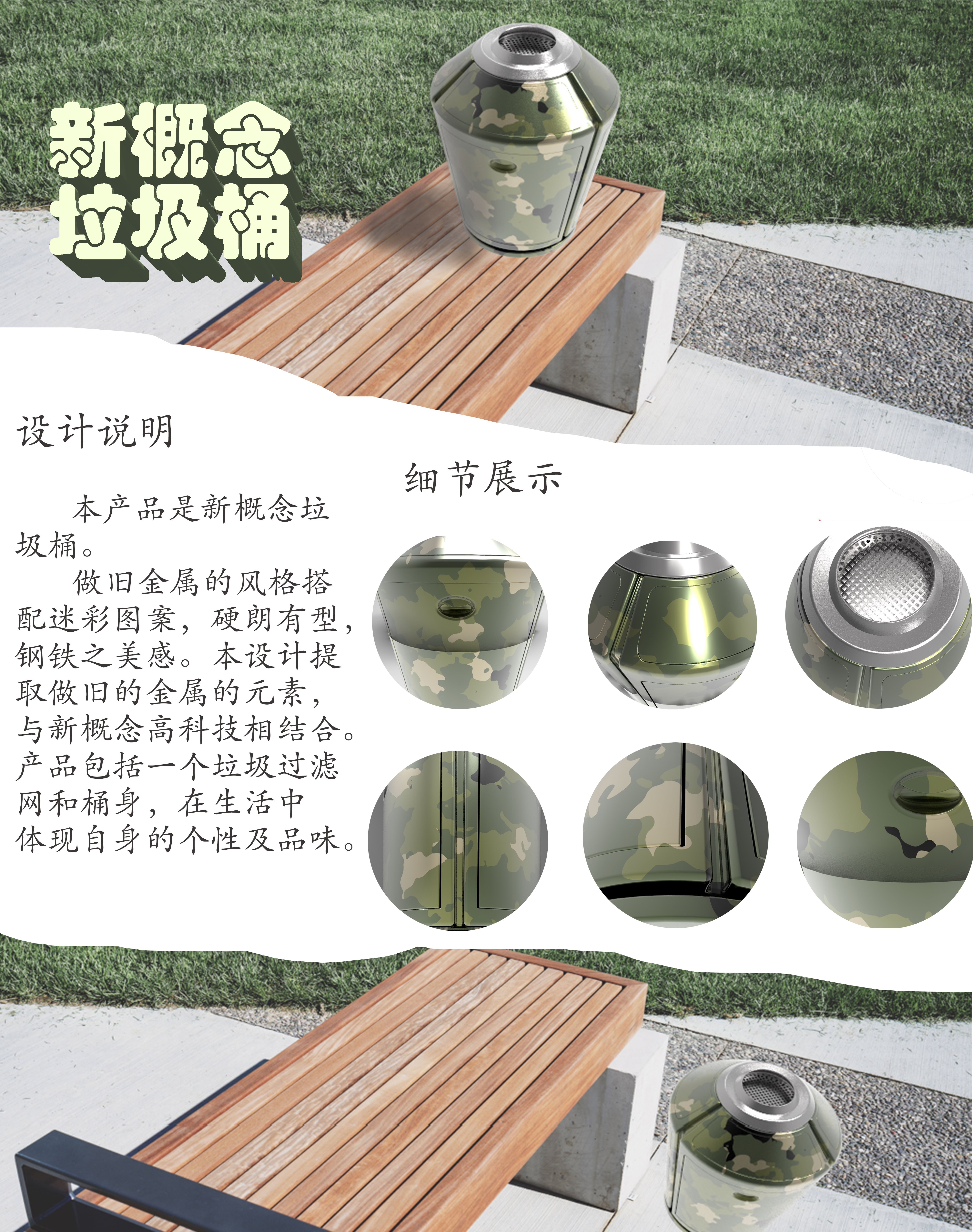 本产品是新概念垃圾桶。 做旧金属的风格搭配迷彩图案,硬朗有型,钢铁之美感。本设计提取做旧的金属的元素,与新概念高科技相结合。产品包括一个垃圾过滤网和桶身,在生活中体现自身的个性及品味。