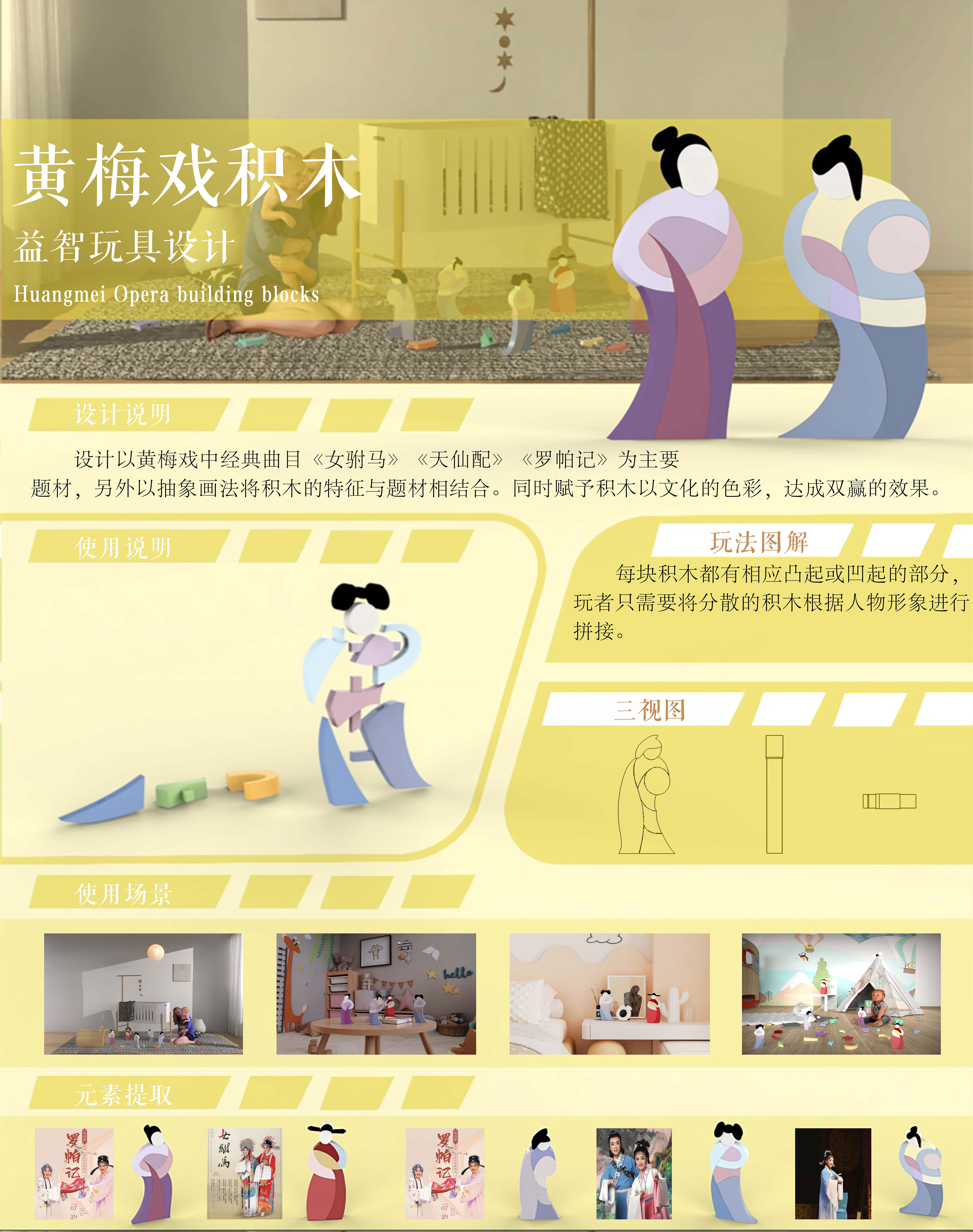 设计以黄梅戏中经典曲目《女驸马》《天仙配》《罗帕记》为主要题材,另外以抽象画法将积木的特征与题材相结合。同时赋予积木以文化的色彩,达成双赢的效果。