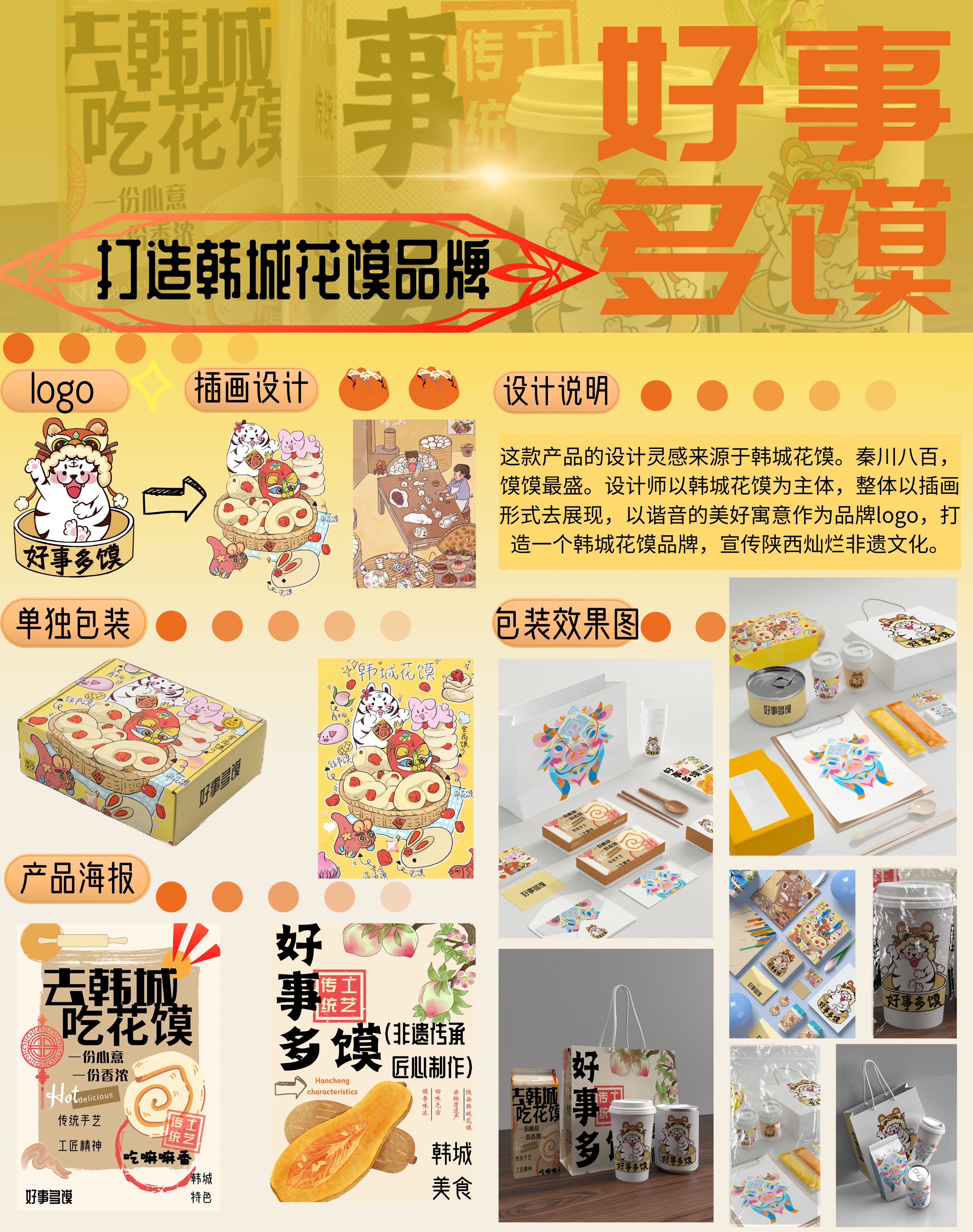 秦川八百,馍馍最盛。本方案是国绕进化-协同-共生这—主题将韩城花馍与产品设计包装相结合,打造一个独具匠心的花馍品牌。设计师提炼花馍中常用的虎形特色作为logo形象,以好事多馍为品牌名称寓意美好末来。通过海报设计及插画的形式包装产品塑造花馍,其中包装涉及明信片周边、购物袋、饮品、花馍礼品包装盒等等领域,充分表现面粉中展开的花花世界,表达非物质文化遗产花馍的艺术,宣传陕西灿烂非遗文化。