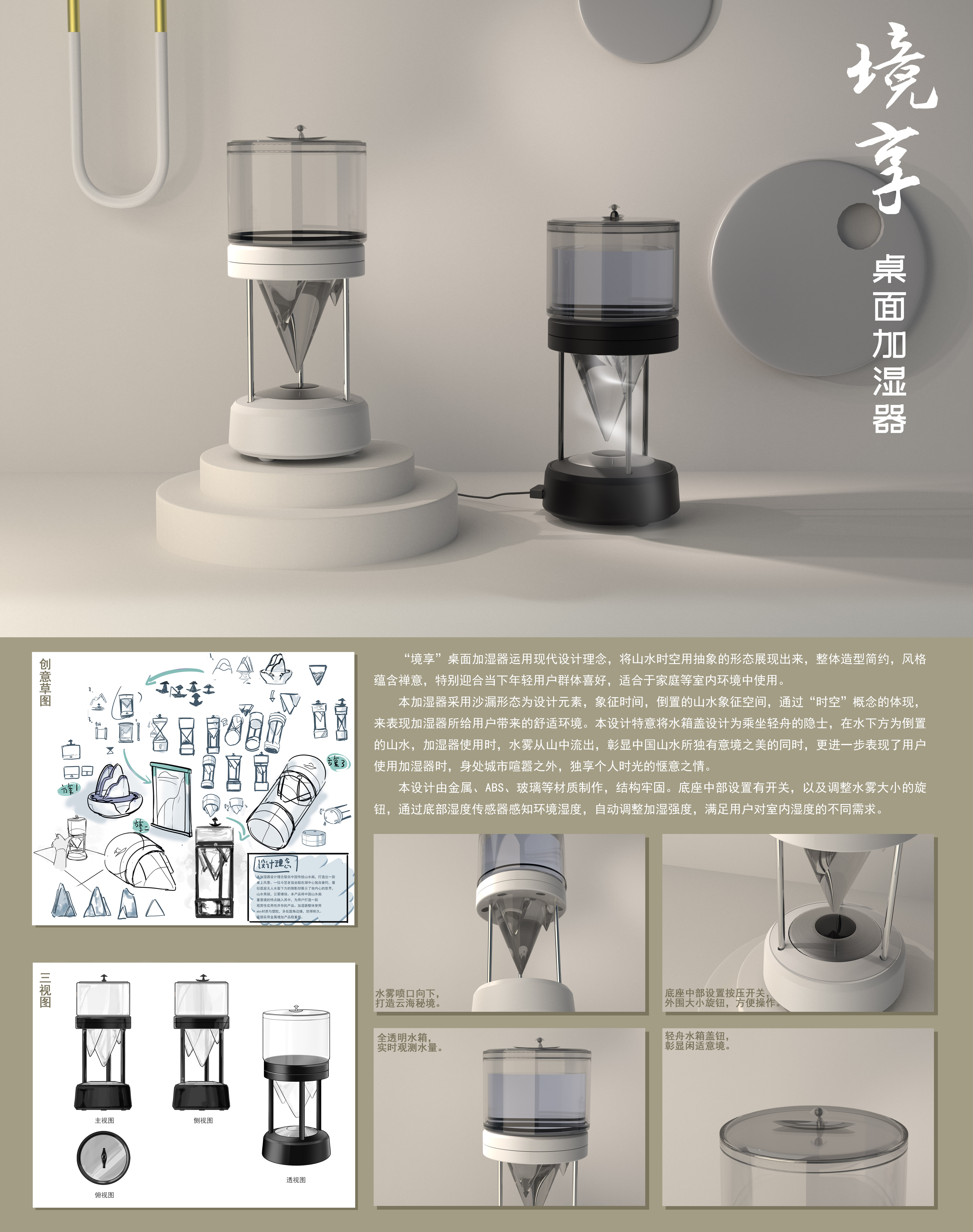 “境享”桌面加湿器采用沙漏、山水、云海、轻舟等形态为设计元素,来表现所给用户带来的舒适环境。加湿器使用时,水雾从山中流出,彰显中国山水所独有意境之美,同时表现了用户使用加湿器时,身处城市喧嚣之外,独享个人时光的惬意之情。 本设计由金属、ABS、玻璃等材质制作,结构牢固。底座中部设置有开关,以及调整水雾大小的旋钮,通过底部湿度传感器感知环境湿度,自动调整加湿强度,满足用户对室内湿度的不同需求。