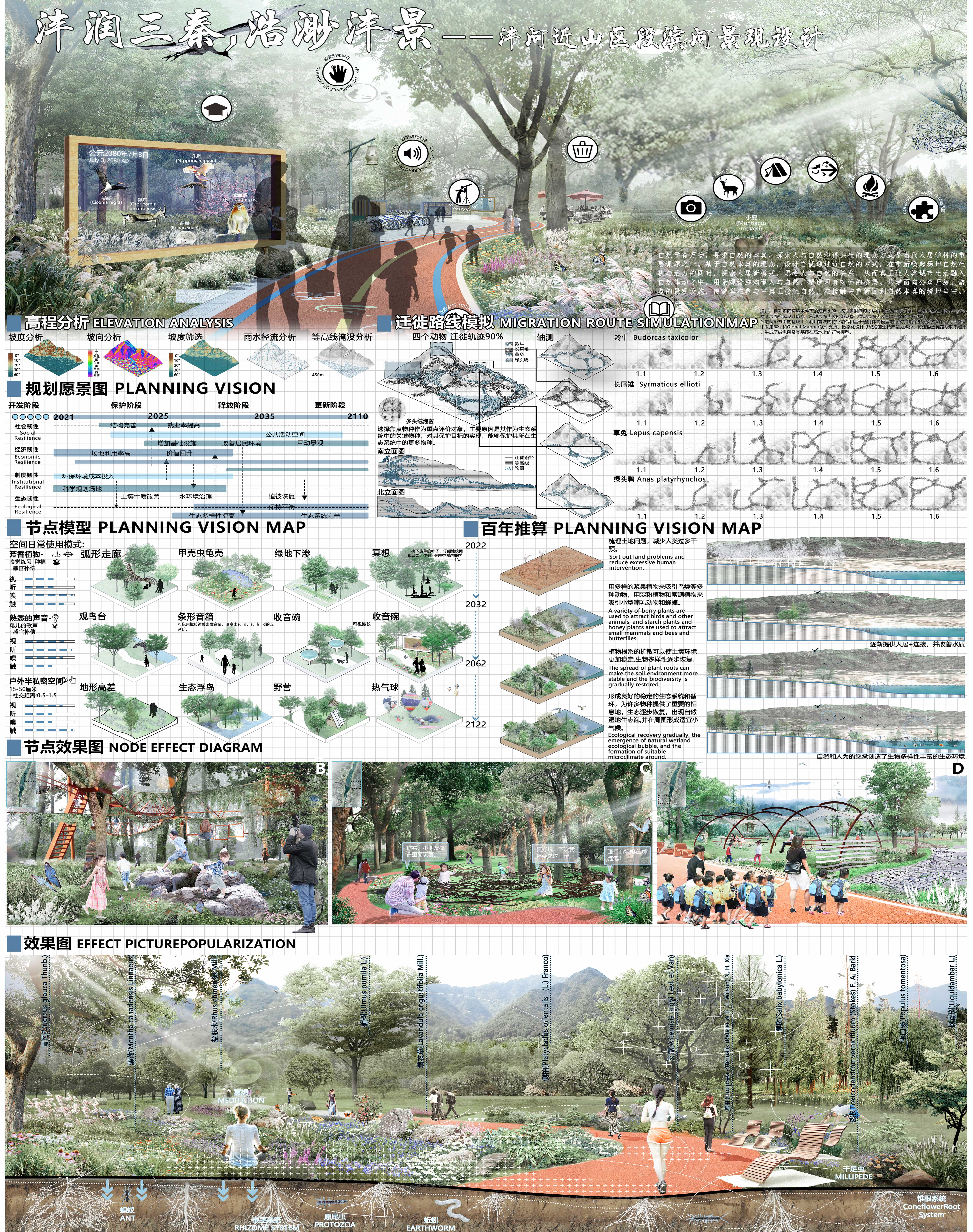 自然孕育万物,寻求自然的本真,探索人与自然和谐共生的理念方式是当代人居学科的重要课题之一。基于自然本真的理念,设计尝试通过近自然的方式,在重新唤起场地自然生机与活力的同时,探索人居新模式,思考人与自然的关系,从而真正让人类城市生活融入自然律动之中,用景观设施沟通人与自然,塑造两者对话的桥梁。营建面向公众开放、游览的景观设施,使游客在参与中真正接触自然,在接触中重新回到自然本真的境地当中。