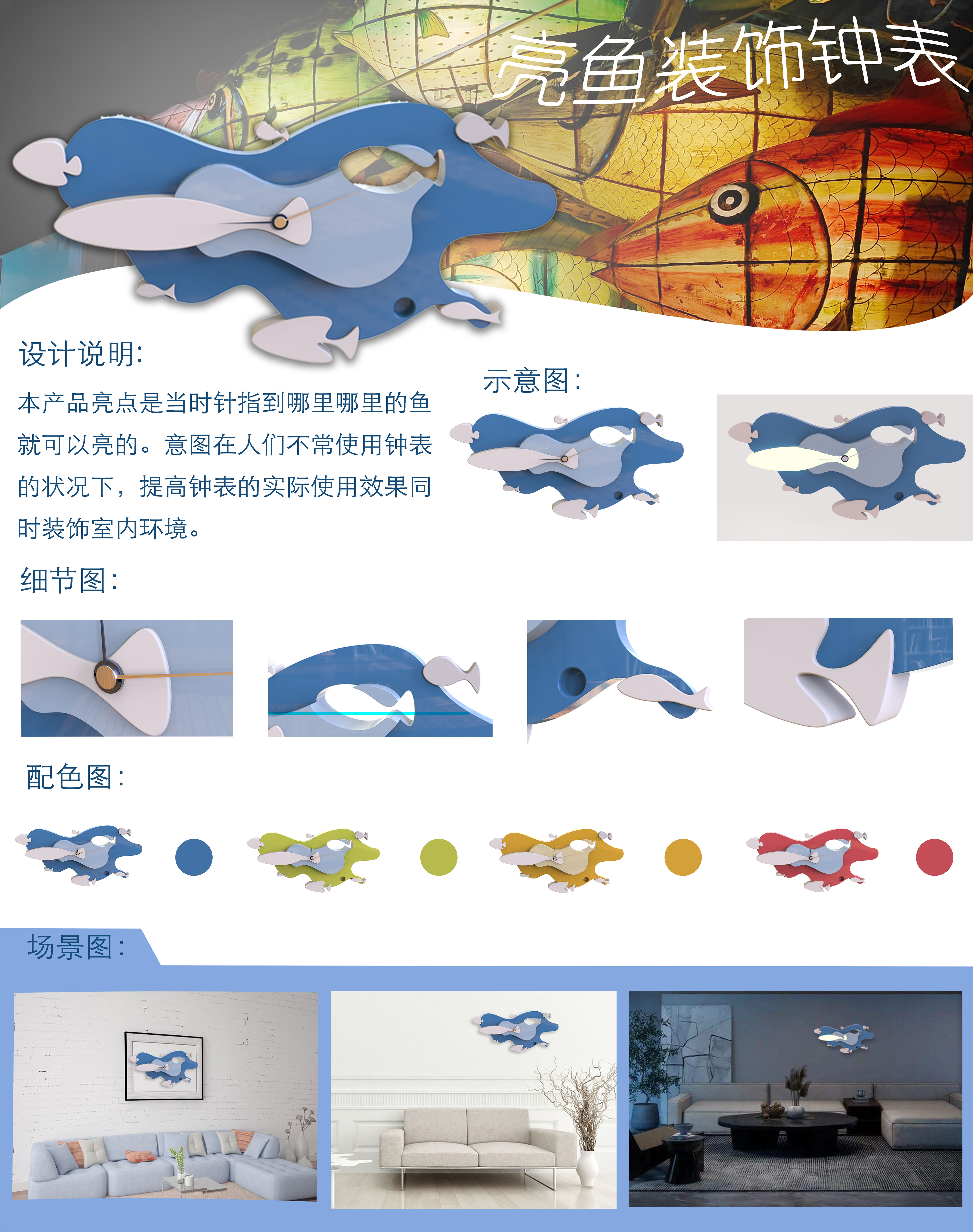 本产品亮点是当时针指到哪里哪里的鱼就可以亮的。意图在人们不常使用钟表的状况下,提高钟表的实际使用效果同时装饰室内环境。