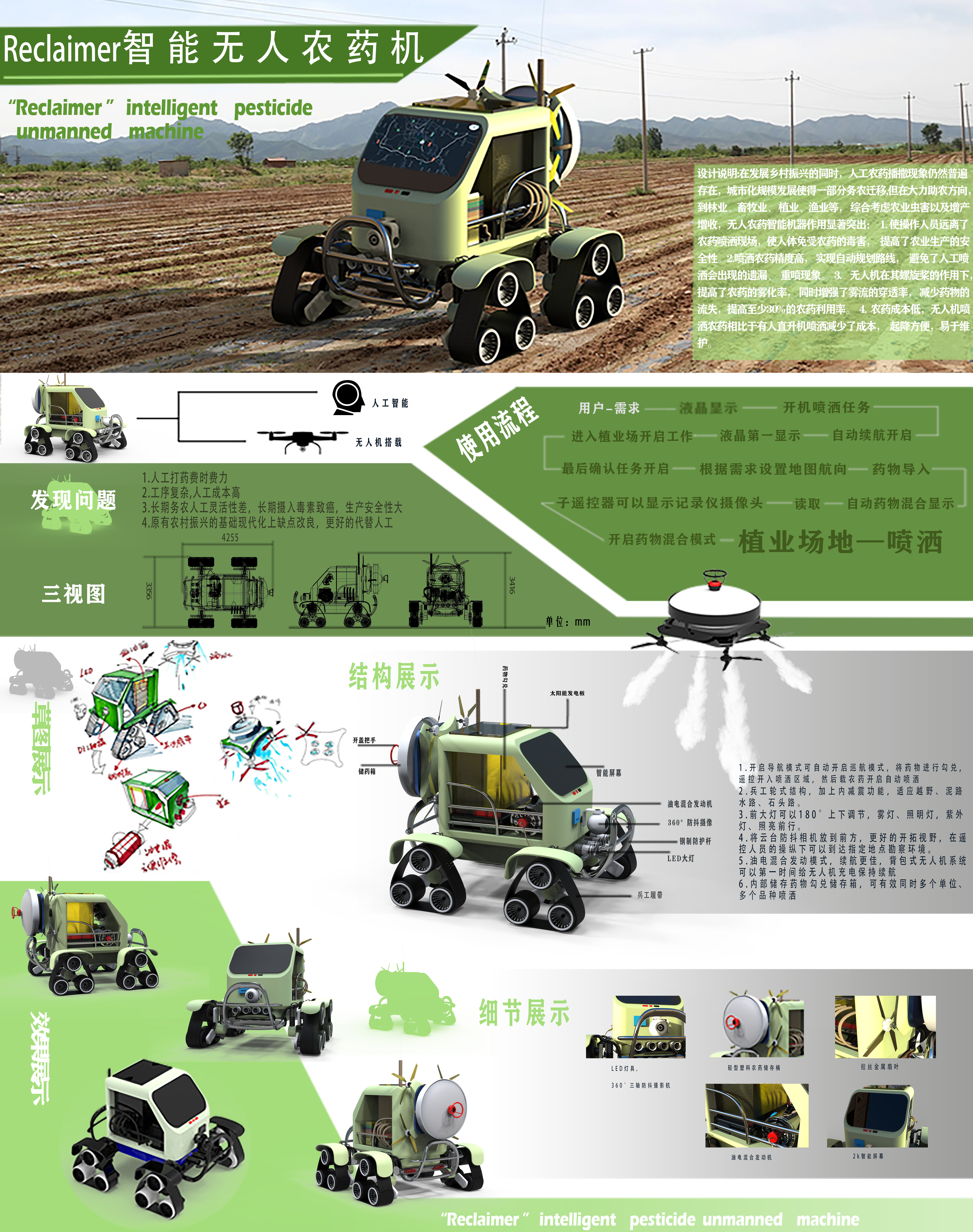 当无人车走进农田,它有了新的名字——智能无人农药机。本无人农药机通过自动导航模式(自行进行药物勾兑,遥控开入喷洒区,自动喷洒)、兵工轮式结构(加以内减震功能,适应各种路况)、云台防抖相机(开拓视野,可遥控前往指定地点勘察)、油电混合发动模式(背包式无人机系统)等技术,减少人力成本,提高农业生产安全性、减少药物流失、提高作业效率、增加续航。本设计将创意带至田间地头,致力于“科技+农业"的有机结合。