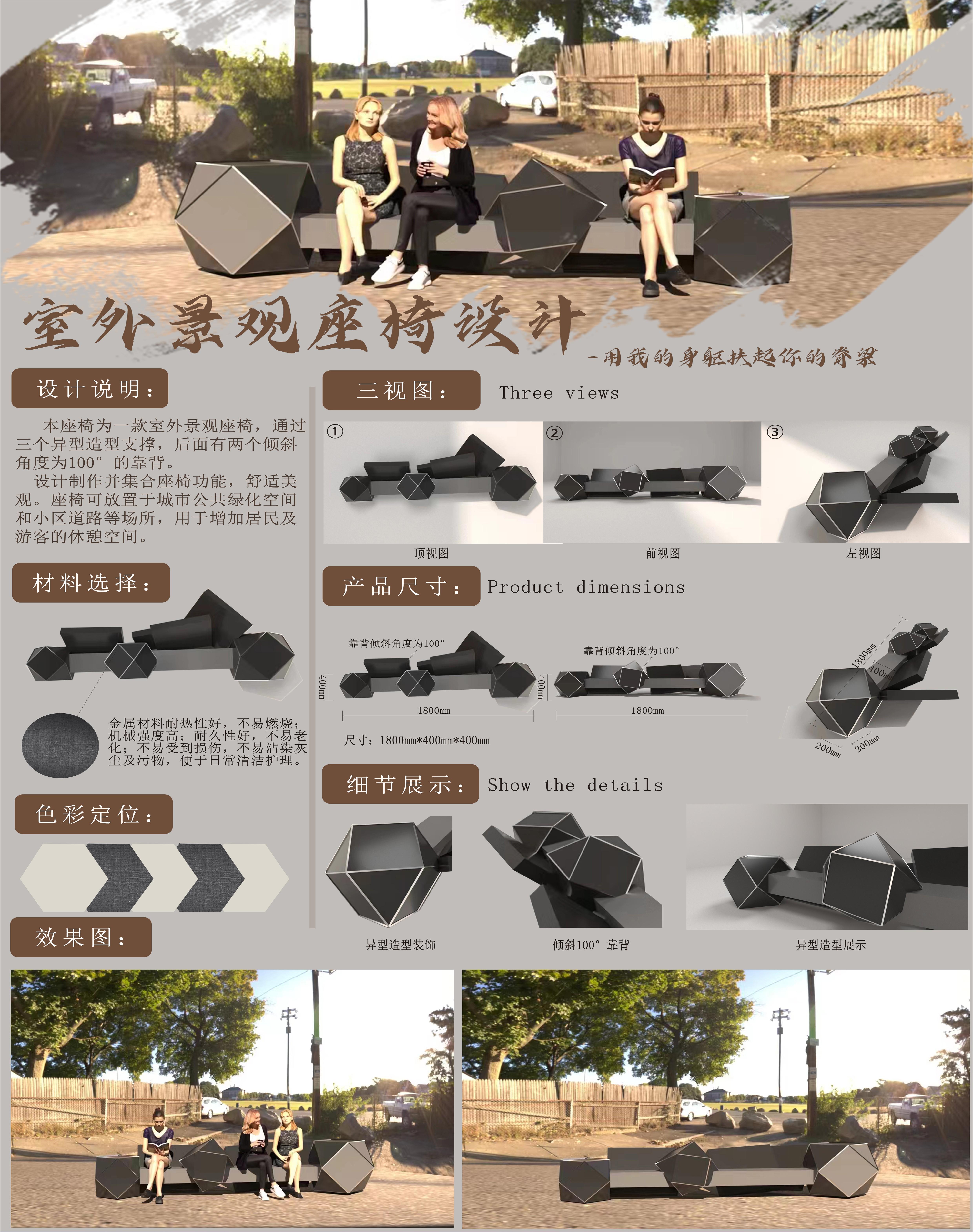 为满足户外休闲需求,本座椅为一款室外景观座椅,通过三个异型造型支撑,后面有两个倾斜角度为100°的靠背设计制作并集合座椅功能,舒适美观。座椅可放置于城市公共绿化空间和小区道路等场所,用于增加居民及游客的休憩空间。其造型独特,材质环保,功能多样性且造价适中,易安装以及方便日常保养。