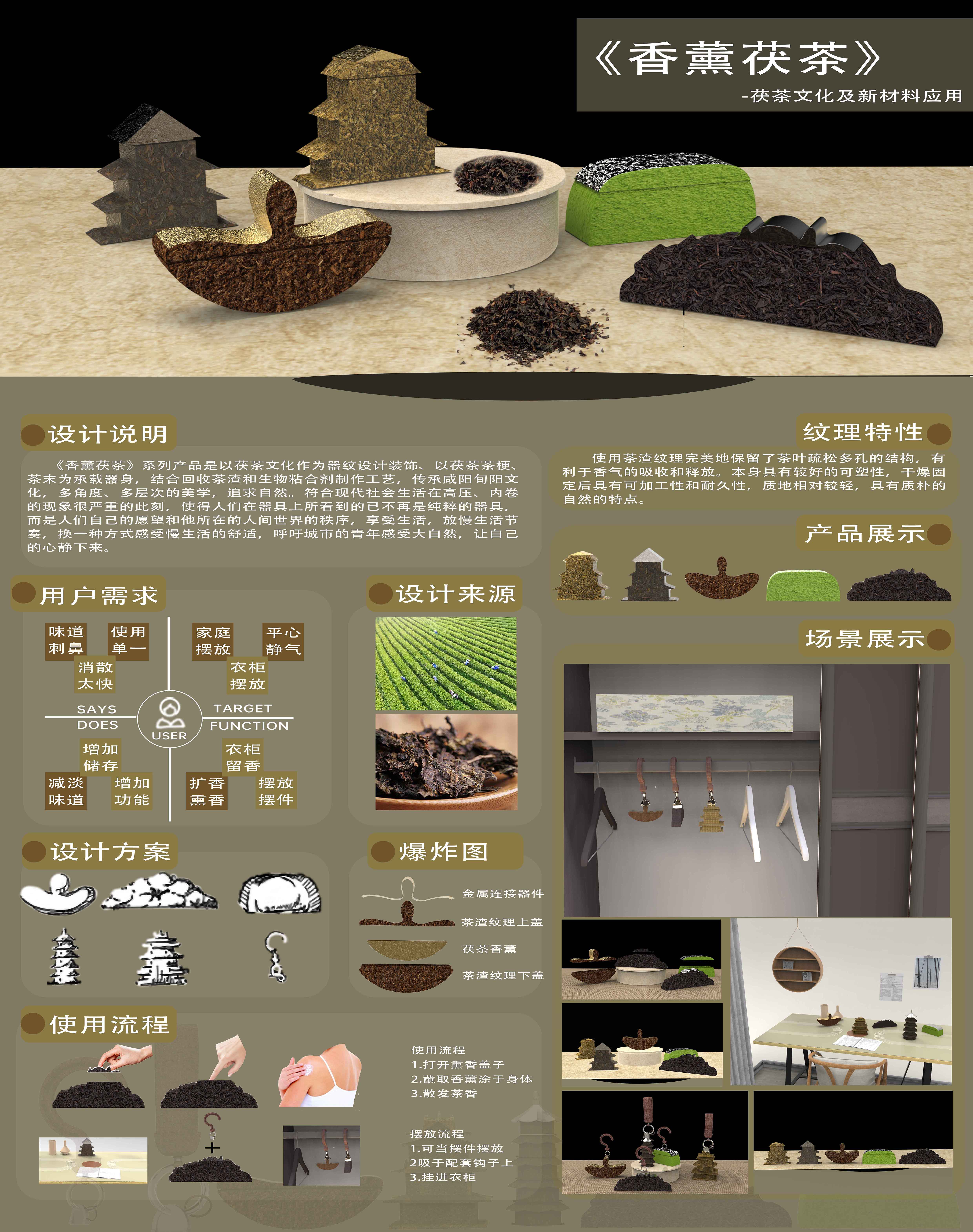 “香薰茯茶”系列产品是以茯茶文化作为器纹设计装饰,以茯茶茶梗,茶末为承载器身,结合回收茶渣和生物粘合剂制作工艺,传承咸阳旬阳文化,多角度、多层次的美学,追求自然。符合现代社会生活在高压、内卷的现象很严重的此刻,使得人们在器具上所看到的已不再是纯粹的器具,而是人们自己的愿望和他所在的人间世界的秩序,享受生活,放慢生活节奏,换一种方式感受慢生活的舒适,呼吁城市的青年感受大自然,让自己的心静下来。