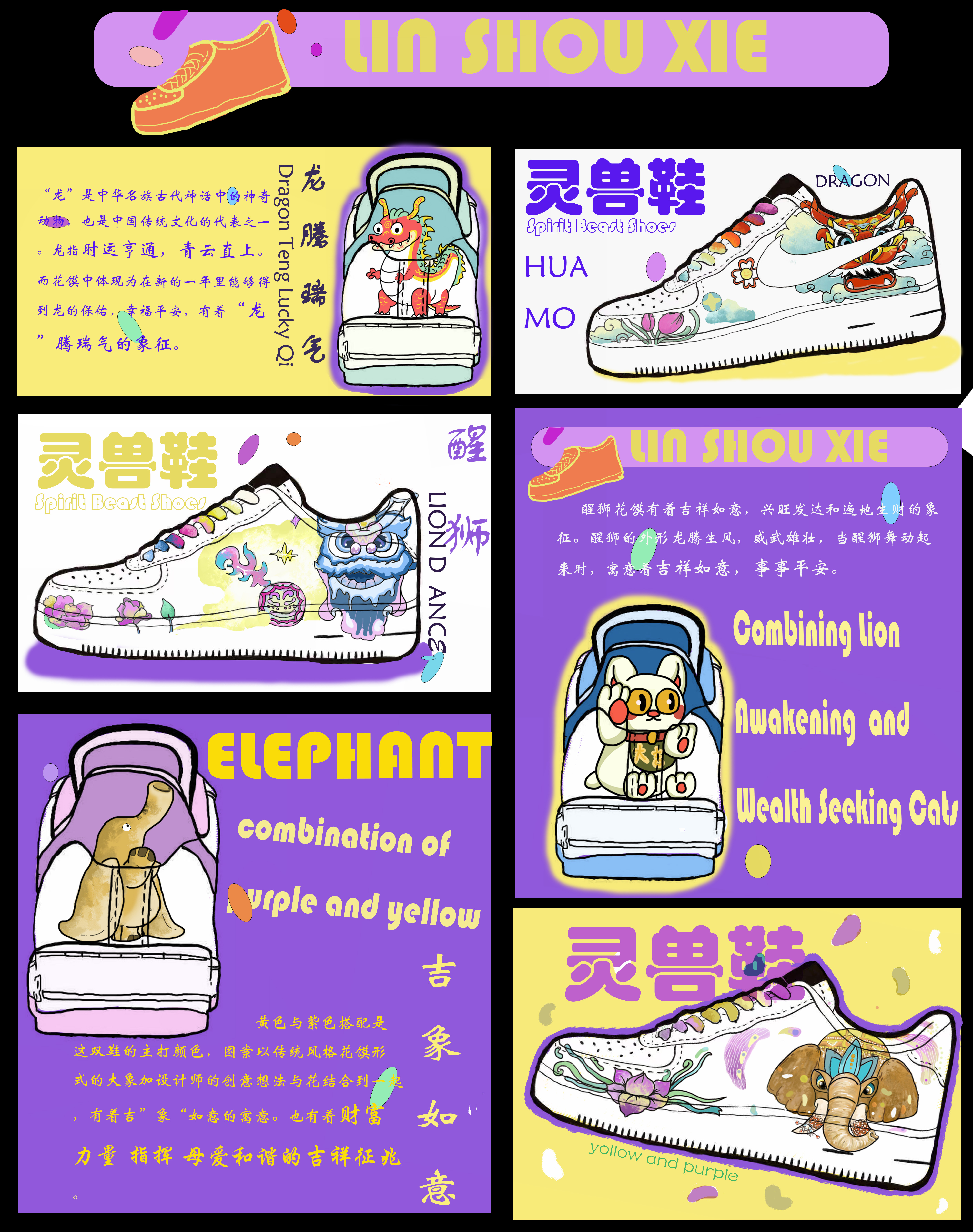 “灵兽”鞋的灵感来源于花馍与大象,醒狮和龙元素的相结合,黄色与紫色搭配是这个主题的主打颜色,其中的图案体现出中国传统文化的美好意愿。龙有着时运亨通, 青云直上 幸福平安和‘龙’腾瑞气的象征;而花馍的醒狮与招财猫图案结合有着吉祥如意,事事平安和兴旺发达的寓意;吉“象”如意中,图案以传统风格花馍形式的大象与花朵为主,也有着财富 力量 指挥 母爱 和谐的吉祥征兆。