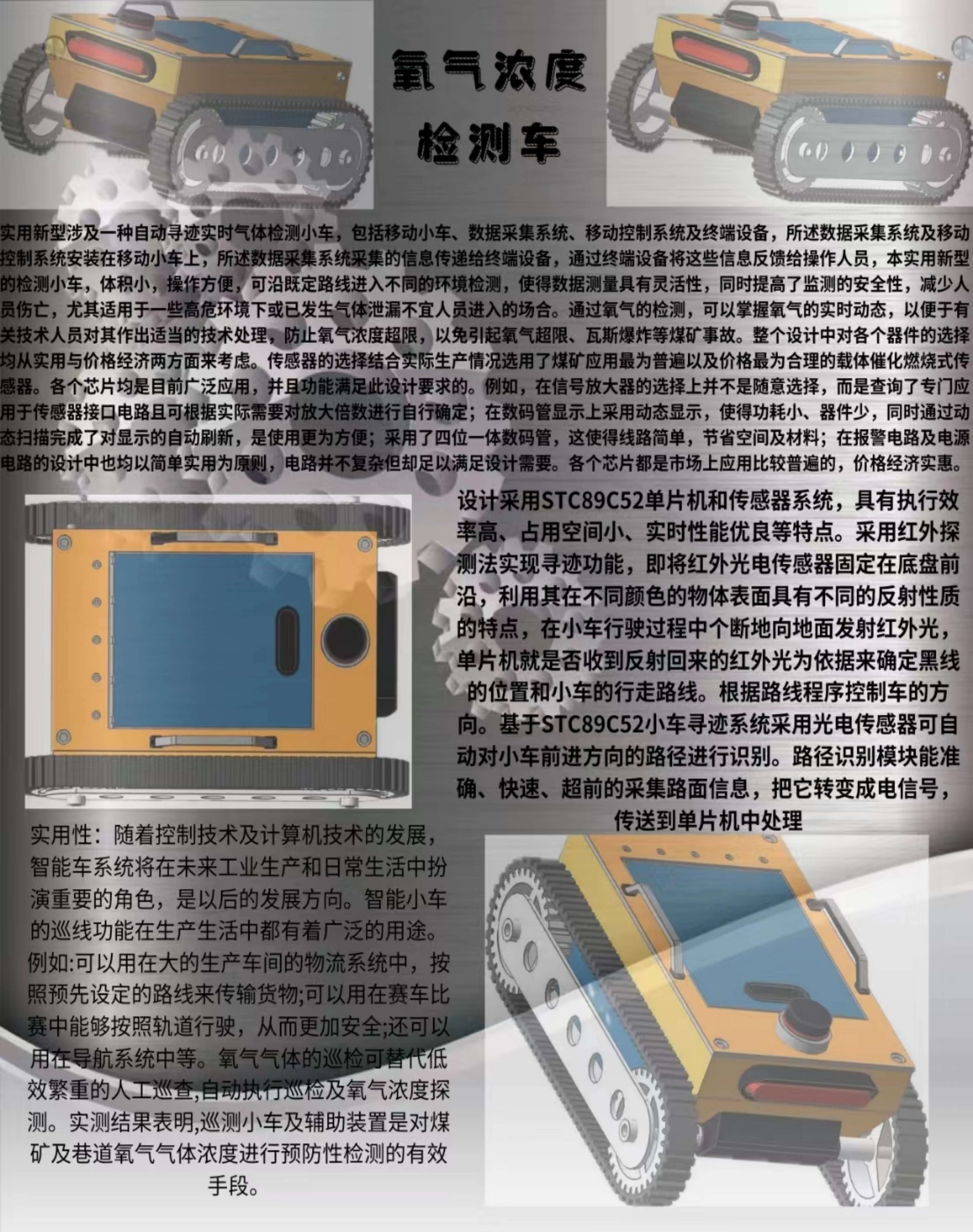 本实用新型的检测小车,体积小,操作方便,可沿既定路线进入不同的环境检测,使得数据测量具有灵活性,同时提高了监测的安全性,减少人员伤亡,尤其适用于一些高危环境下通过氧气的检测,可以掌握氧气的实时动态,以便于有关技术人员对其作出适当的技术处理,防止氧气浓度过低。