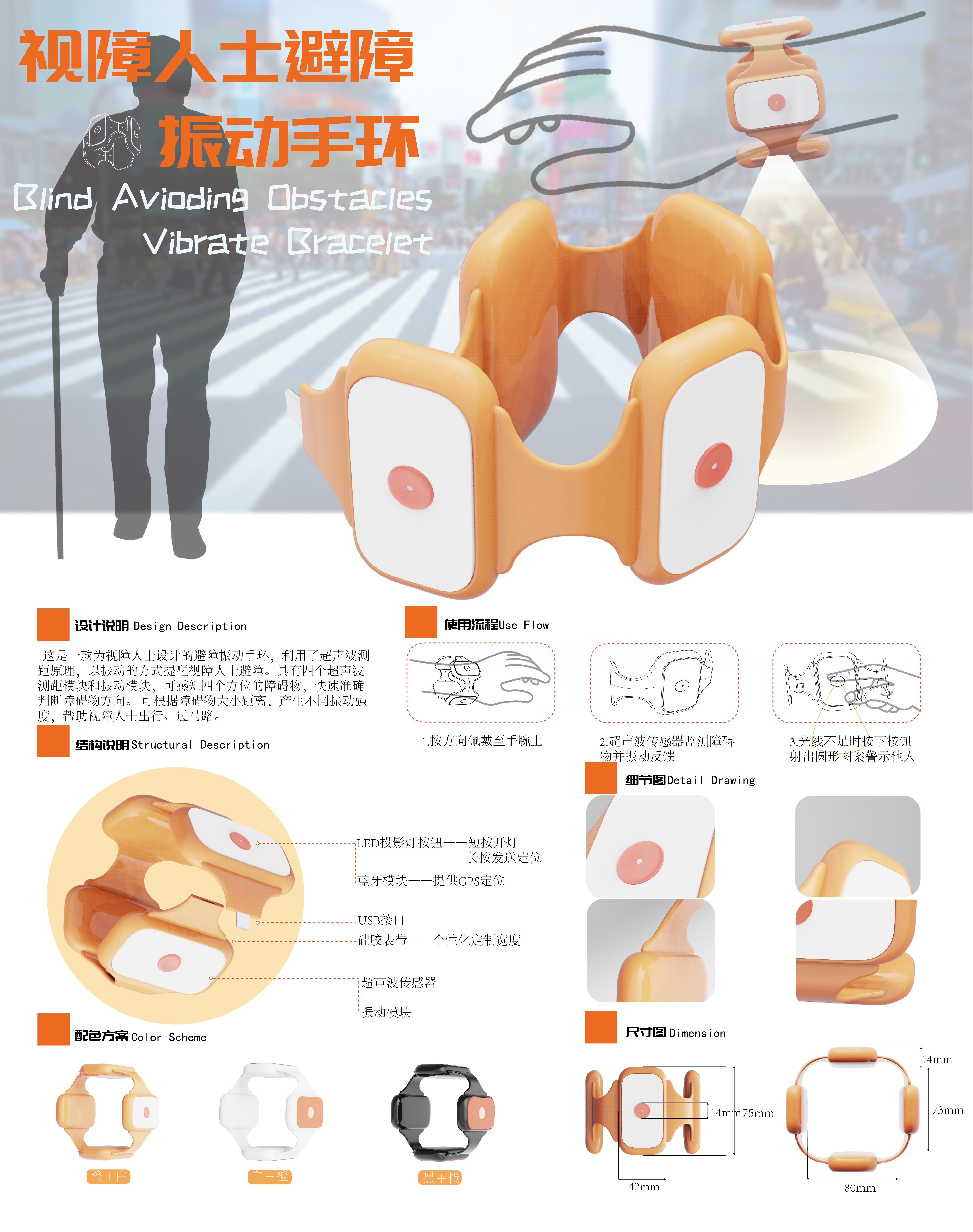 这是一款为视障人士设计的避障振动手环,利用了超声波测距原理,以振动的方式提醒视障人士避障。具有四个超声波测距模块和振动模块,可感知四个方位的障碍物,快速准确判断障碍物方向。 可根据障碍物大小距离,产生不同振动强度,帮助视障人士出行、过马路。