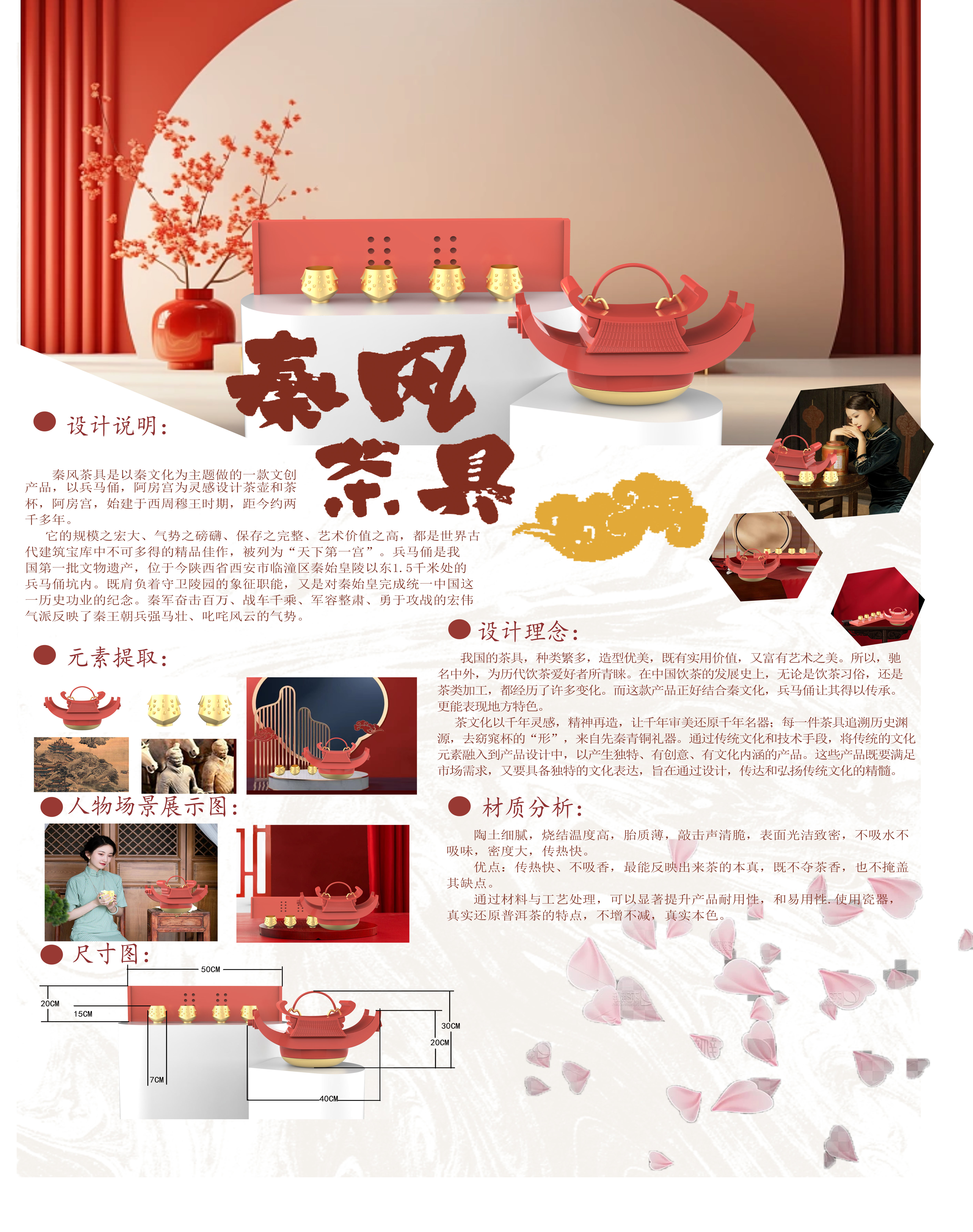秦风茶具是以秦文化为主题做的一款文创产品,以兵马俑,阿房宫为灵感设计茶壶和茶杯,阿房宫,始建于西周穆王时期,距今约两千多年。 我国的茶具,种类繁多,造型优美,既有实用价值,又富有艺术之美。所以,驰名中外,为历代饮茶爱好者所青睐。在中国饮茶的发展史上,无论是饮茶习俗,还是茶类加工,都经历了许多变化。而这款产品正好结合秦文化,兵马俑让其得以传承。更能表现地方特色。