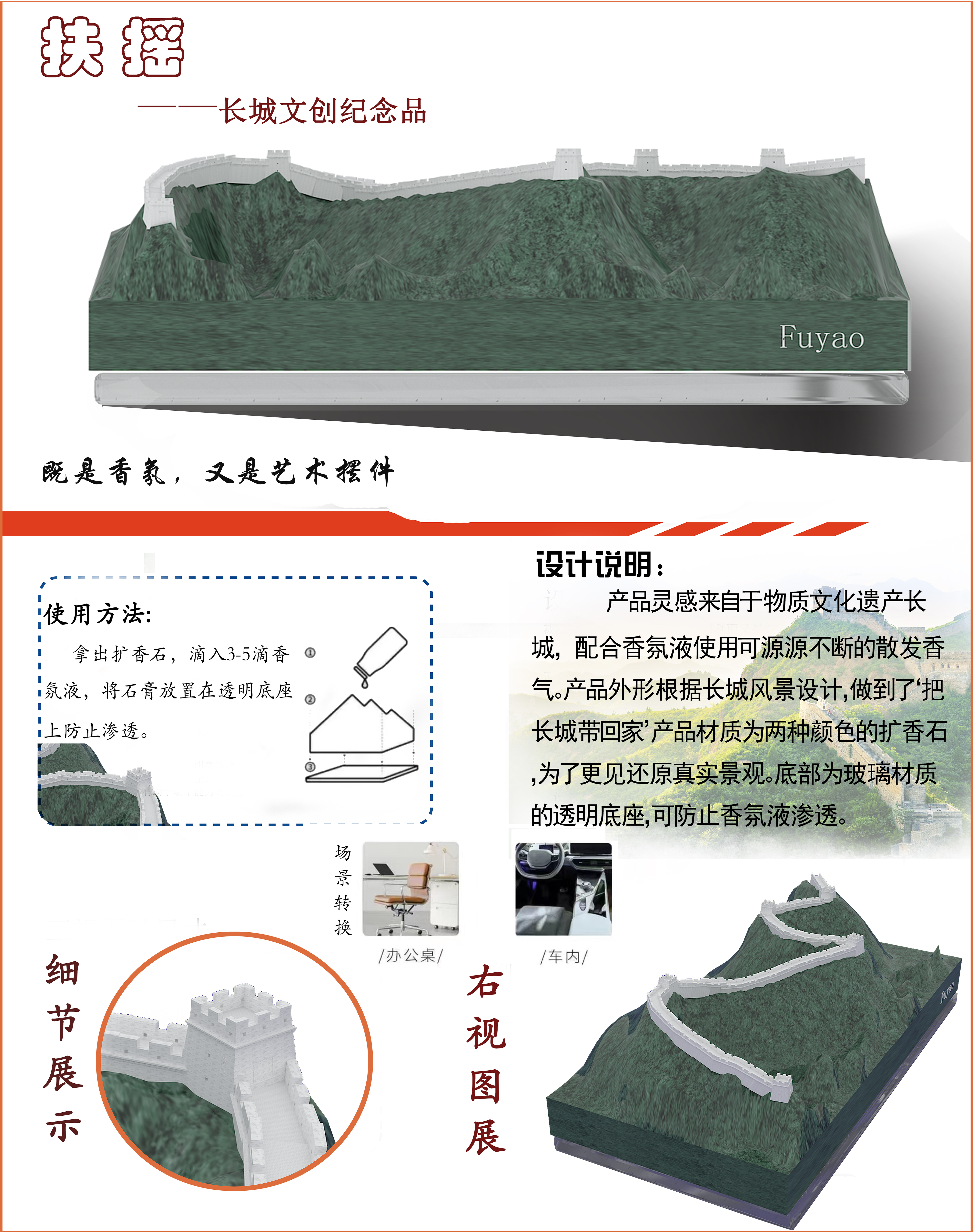 产品灵感来自于物质文化遗产长城,配合香氛液使用可源源不断的散发香气。产品外形根据长城风景设计,做到了‘把长城带回家’产品材质为两种颜色的扩香石,为了更还原真实景观。底部为玻璃材质的透明底座,可防止香薰液渗透。