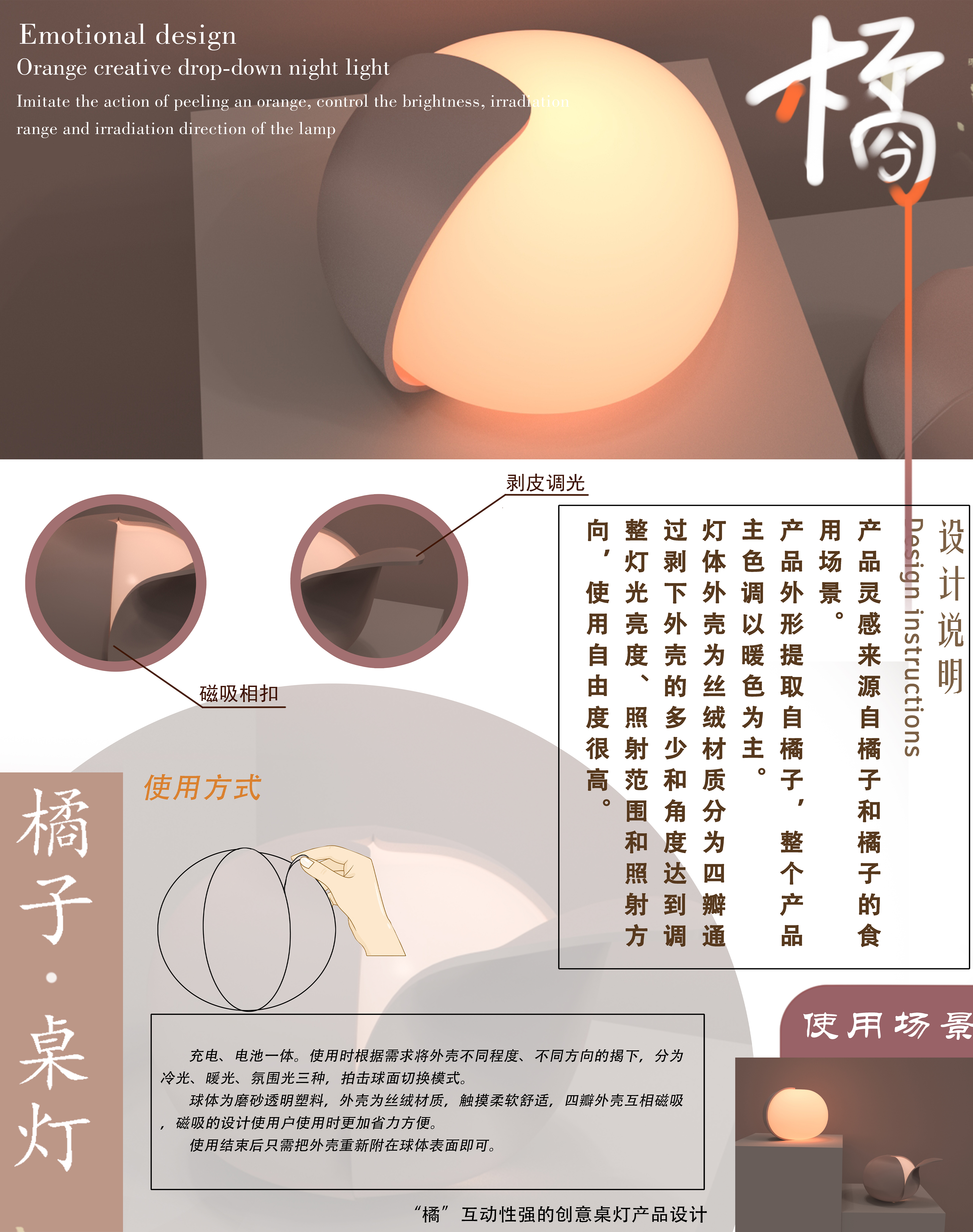 产品灵感来源自橘子和橘子的食用场景。 产品外形提取自橘子,整个产品主色调以暖色为主。 灯体外壳为丝绒材质分为四瓣通过剥下外壳的多少和角度达到调整灯光亮度、照射范围和照射方向,使用自由度很高。