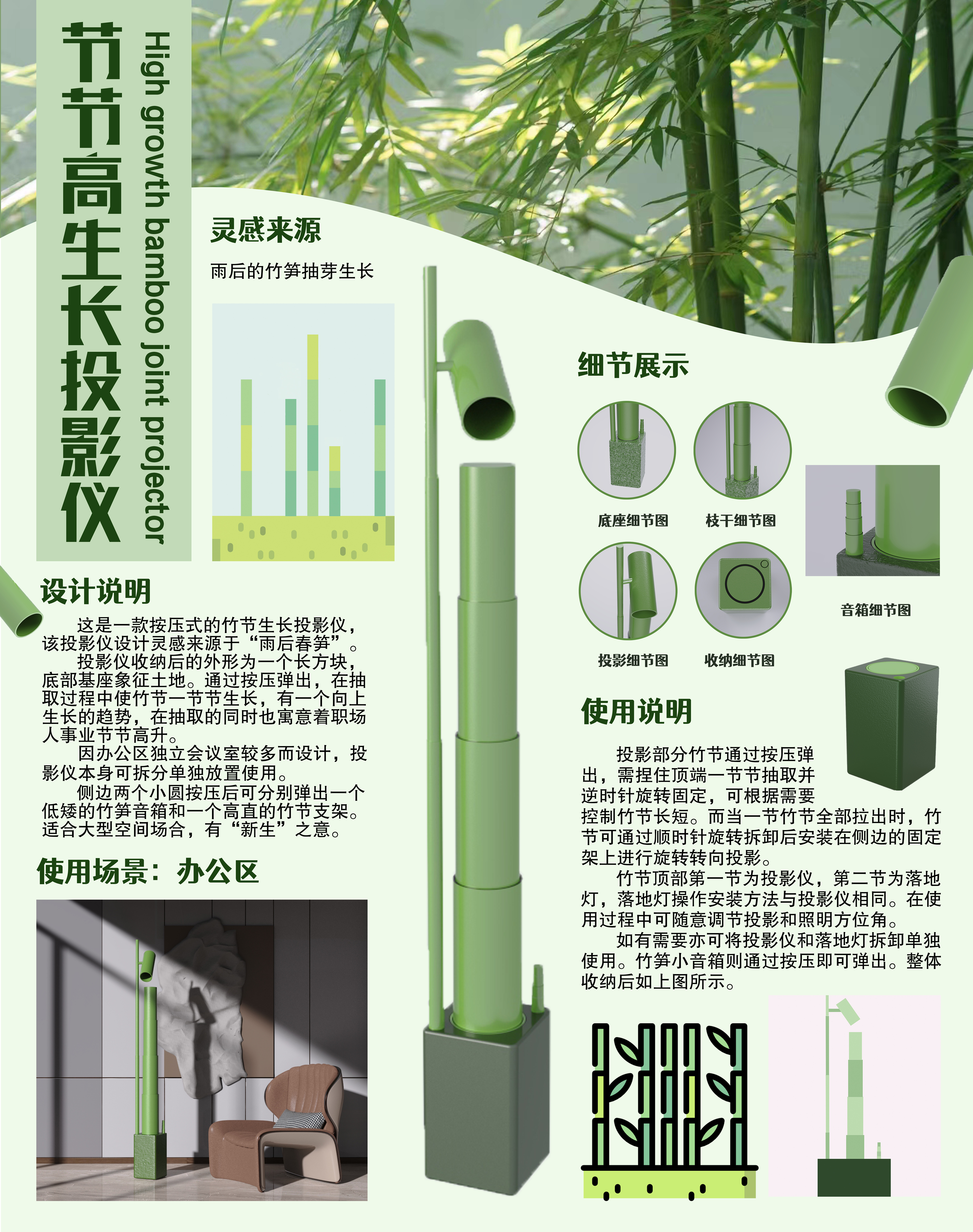 这是一款按压式的竹节生长投影仪,该投影仪设计灵感来源于“雨后春笋”。投影仪收纳后的外形为一个长方块,底部基座象征土地。通过按压弹出,在抽取过程中使竹节一节节生长,有一个向上生长的趋势,在抽取的同时也寓意着职场人事业节节高升。因办公区独立会议室较多而设计,投影仪本身可拆分单独放置使用。侧边两个小圆按压后可分别弹出一个低矮的竹笋音箱和一个高直的竹节支架。适合大型空间场合,有“新生”之意。