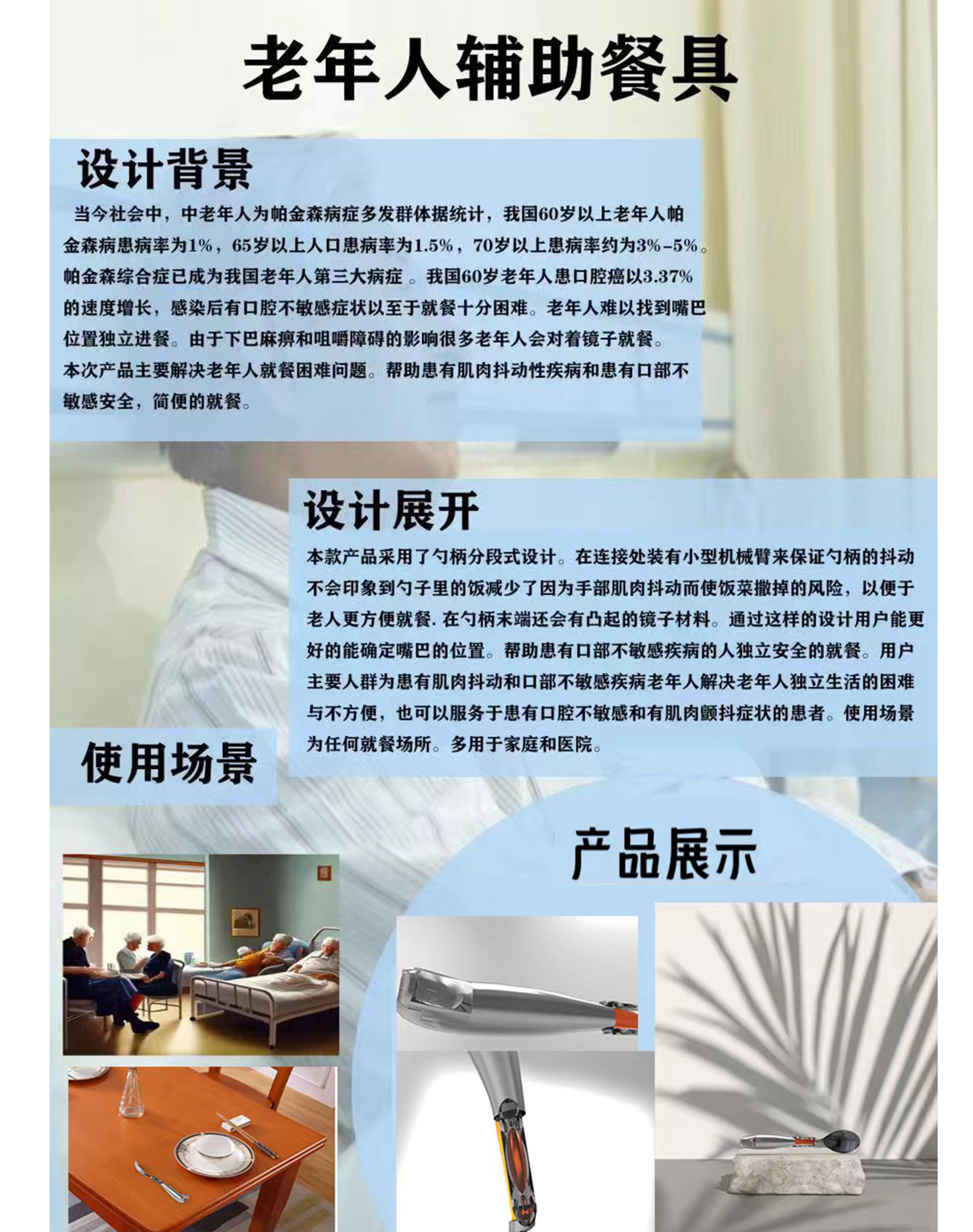 本款产品采用了勺柄分段式设计。在连接处装有小型机械臂来保证勺柄的抖动不会印象到勺子里的饭减少了因为手部肌肉抖动而使饭菜撒掉的风险,以便于老人更方便就餐.在勺柄末端还会有凸起的镜子材料。通过这样的设计用户能更好的能确定嘴巴的位置。帮助患有口部不敏感疾病的人独立安全的就餐。用户主要人群为患有肌肉抖动和口部不敏感疾病老年人解决老年人独立生活的困难与不方便,也可以服务于患有口腔不敏感和有肌肉颤抖症状的患者