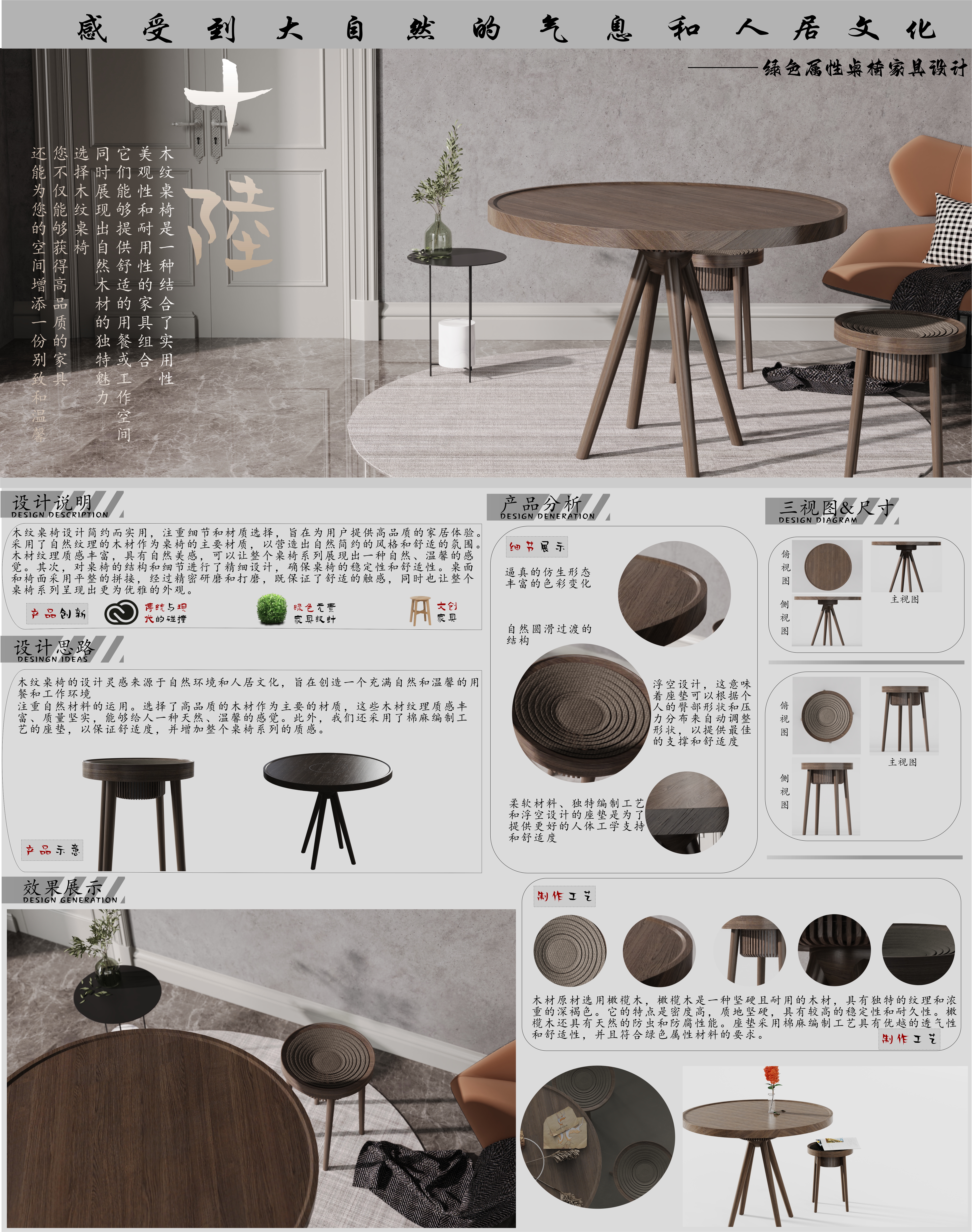 木纹桌椅设计简约而实用,注重细节和材质选择,旨在为用户提供高品质的家居体验。采用了自然纹理的木材作为桌椅的主要材质,以营造出自然简约的风格和舒适的氛围。木材纹理质感丰富,具有自然美感,可以让整个桌椅系列展现出一种自然、温馨的感觉。其次,对桌椅的结构和细节进行了精细设计,确保桌稳定性和舒适性。桌面和椅面采用平整的拼接,经过精密研磨和打磨,既保证了舒适触感,同时让整个桌椅系列呈现更为优雅的外观。