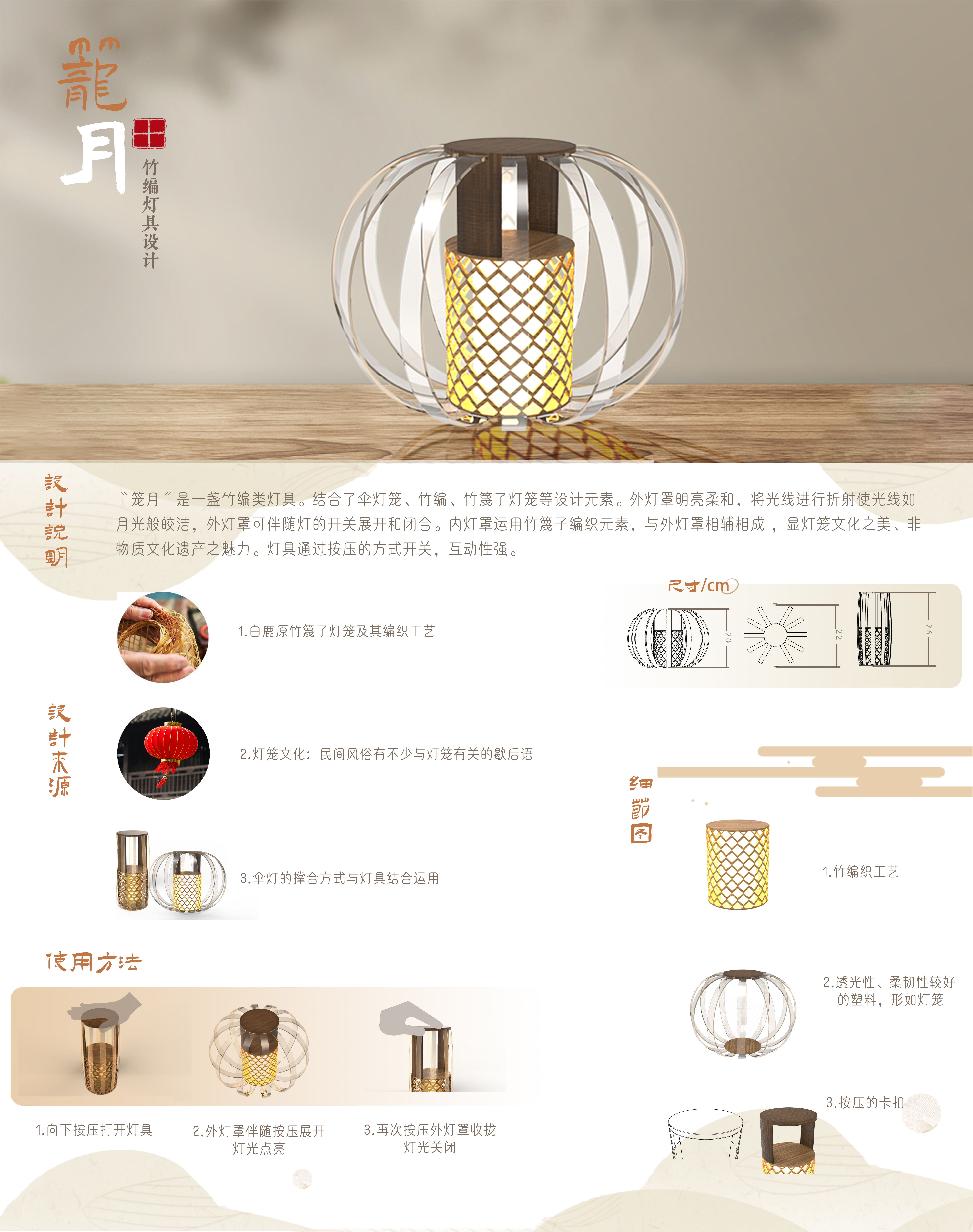 〝笼月〞是一盏竹编类灯具。结合了伞灯笼、竹编、竹篾子灯笼等设计元素。外灯罩明亮柔和,将光线进行折射使光线如月光般皎洁,外灯罩可伴随灯的开关展开和闭合。内灯罩运用竹篾子编织元素,与外灯罩相辅相成 ,显灯笼文化之美、非物质文化遗产之魅力。灯具通过按压的方式开关,互动性强。