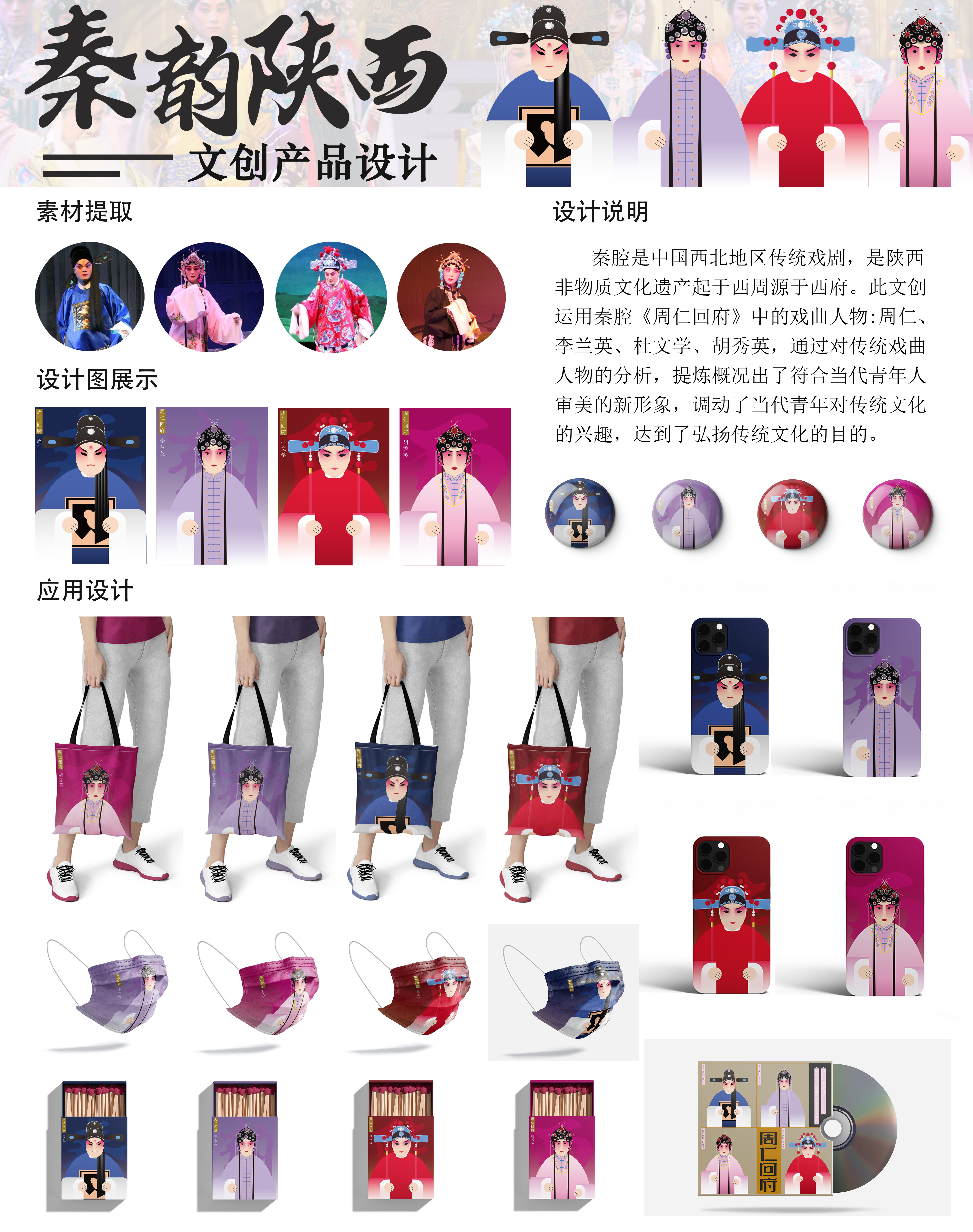 秦腔是中国西北地区传统戏剧,是陕西非物质文化遗产起于西周源于西府。此文创运用秦腔《周仁回府》中的戏曲人物:周仁、李兰英、杜文学、胡秀英,通过对传统戏曲人物的分析,提炼概况出了符合当代青年人审美的新形象,调动了当代青年对传统文化的兴趣,达到了弘扬传统文化的目的。
