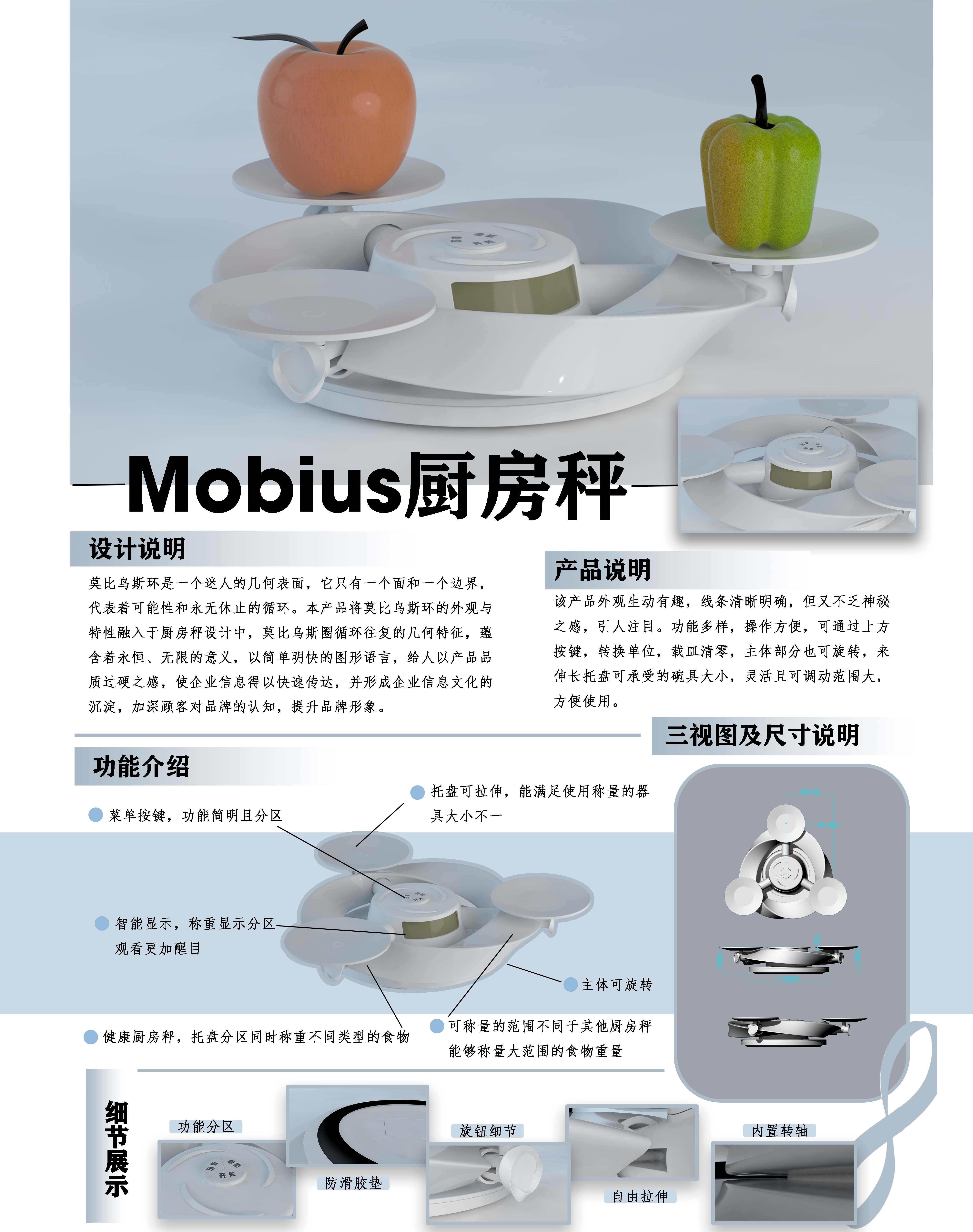 莫比乌斯环是一个迷人的几何表面,它只有一个面和一个边界, 代表着可能性和永无休止的循环。本产品将莫比乌斯环的外观与 特性融入于厨房秤设计中,莫比乌斯圈循环往复的几何特征,蕴 含着永恒、无限的意义,以简单明快的图形语言,给人以产品品 质过硬之感,使企业信息得以快速传达,并形成企业信息文化的 沉淀,加深顾客对品牌的认知,提升品牌形象。