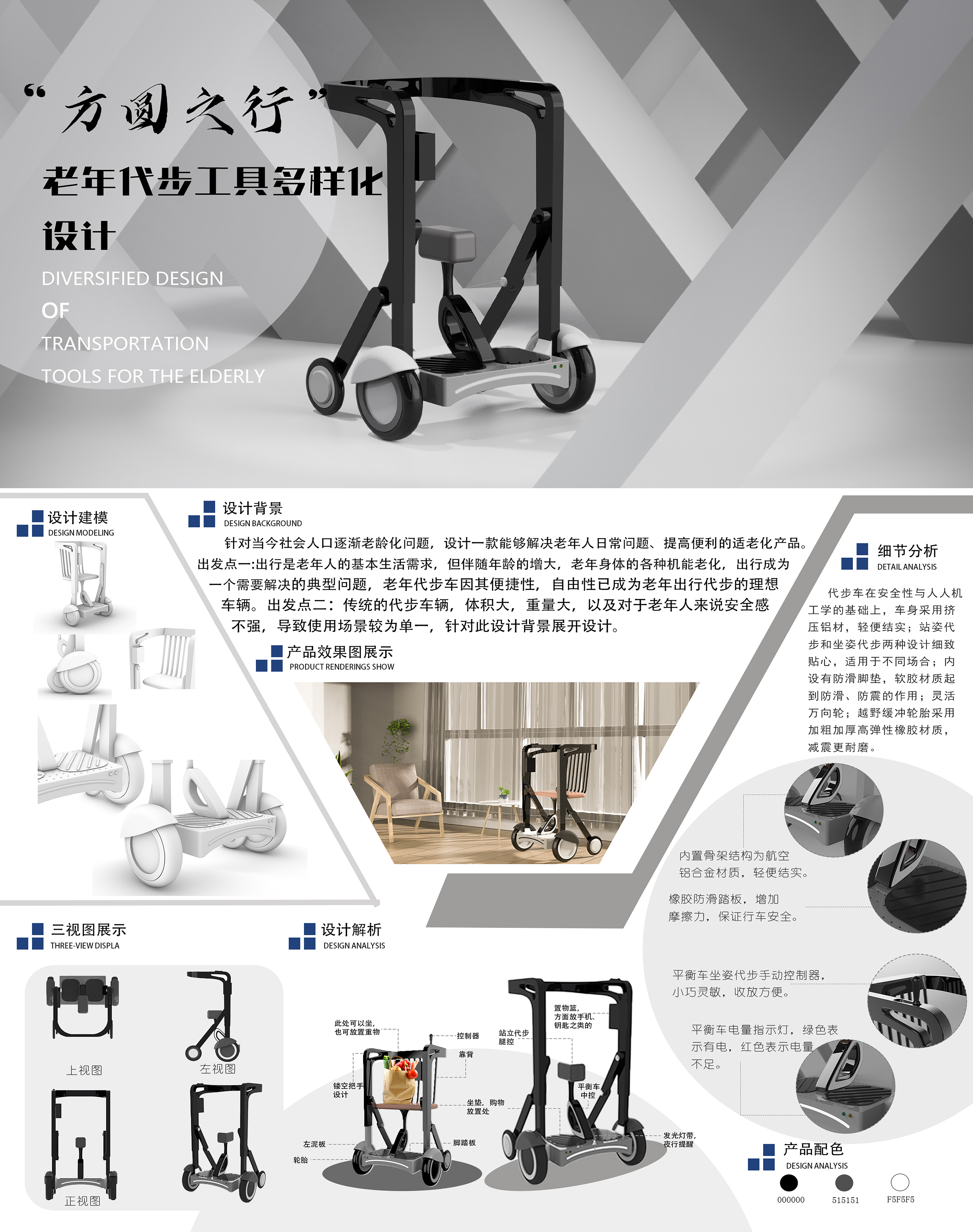针对当今社会人口逐渐老龄化问题,设计一款能够解决老年人日常问题、提高便利的适老化产品出发点一:出行是老年人的基本生活需求,但伴随年龄的增大,老年身体的各种机能老化,出行成为需要解决的典型问题,老年代步车因其便捷性,自由性已成为老年出行代步的理想车辆。出发点二:传统的代步车辆,体积大,重量大,以及对于老年人来说安全感不强,导致使用场景较为单一,针对此设计背景展开设计。