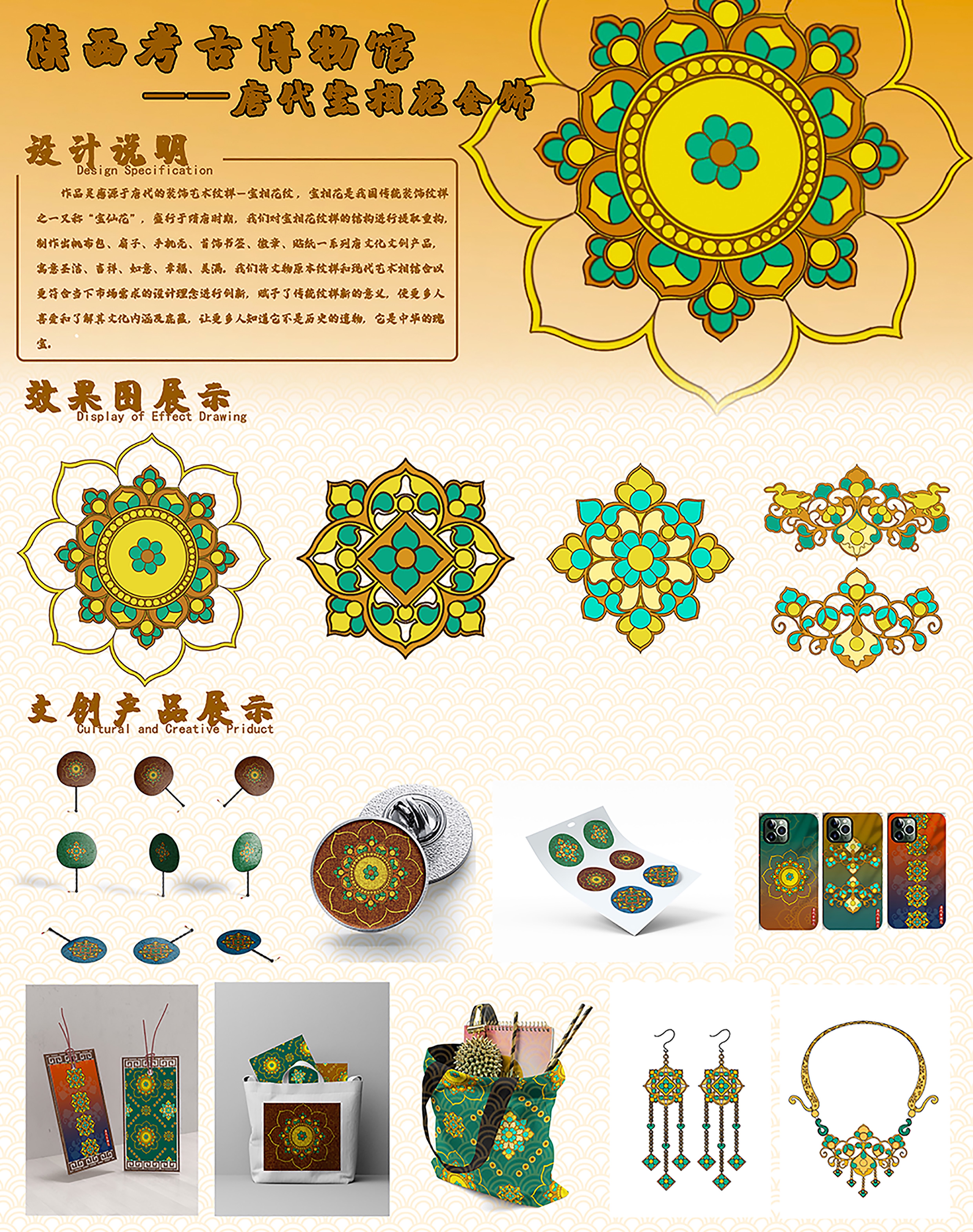 作品灵感源于唐代的装饰艺术纹样—宝相花纹 ,盛行于隋唐时期,我们对宝相花纹样的结构进行提取重构,制作出帆布包、扇子、手机壳、首饰书签、徽章、贴纸一系列唐文化文创产品,寓意圣洁、吉祥、如意、幸福、美满。我们将文物原本纹样和现代艺术相结合以更符合当下市场需求的设计理念进行创新,赋予了传统纹样新的意义,使更多人喜爱和了解其文化内涵及底蕴,让更多人知道它不是历史的遗物,它是中华的瑰宝。