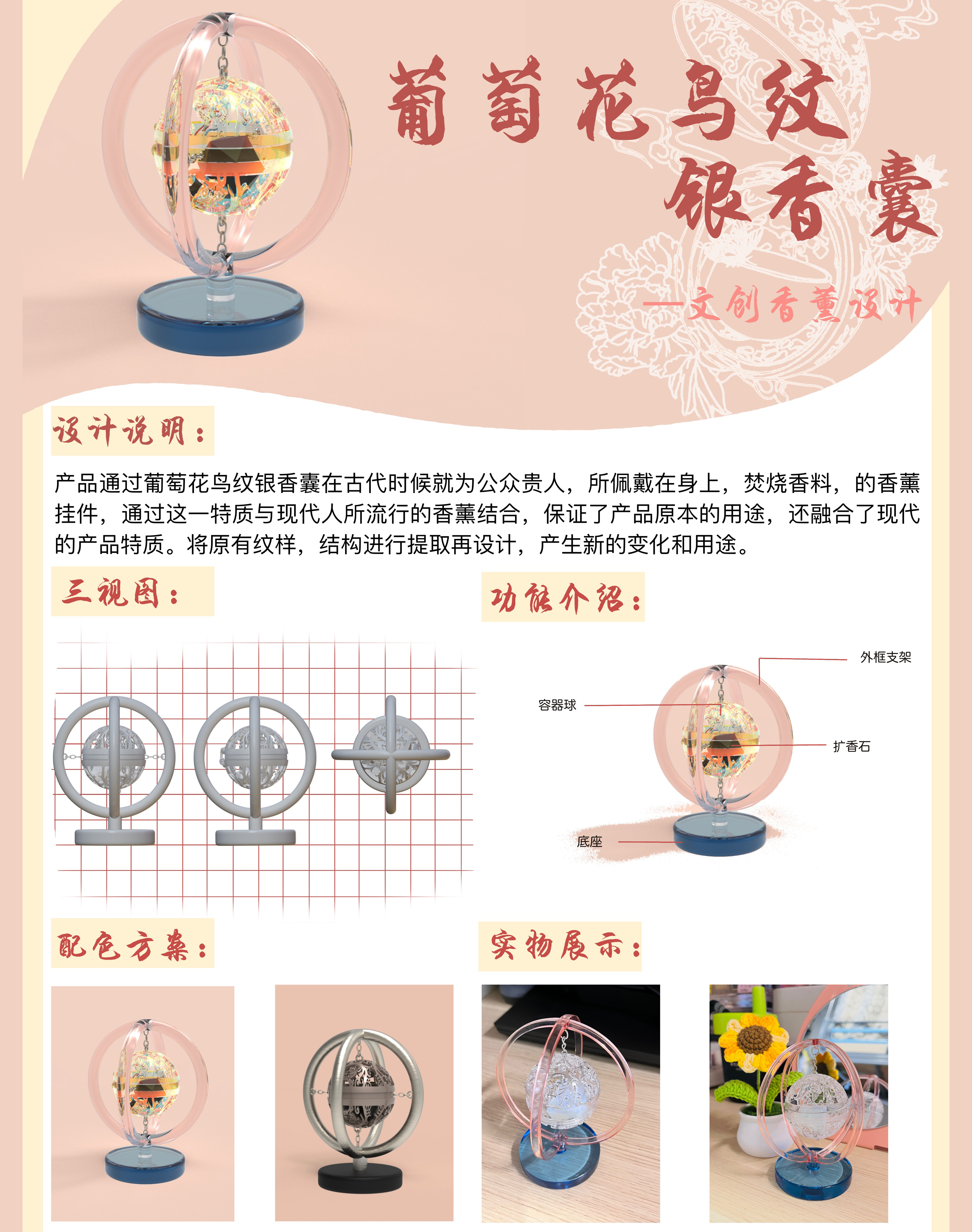 Bean: 产品通过葡萄花鸟纹银香囊在古代时候就为公众贵人,所佩,戴在身上,焚烧香料,的香薰挂件,通过这一特质与现代人所流行的香薰结合,保证了产品原本的用途,还融合了现代的产品特质。将原有纹样,结构进行提取再设计,产生新的变化和用途。