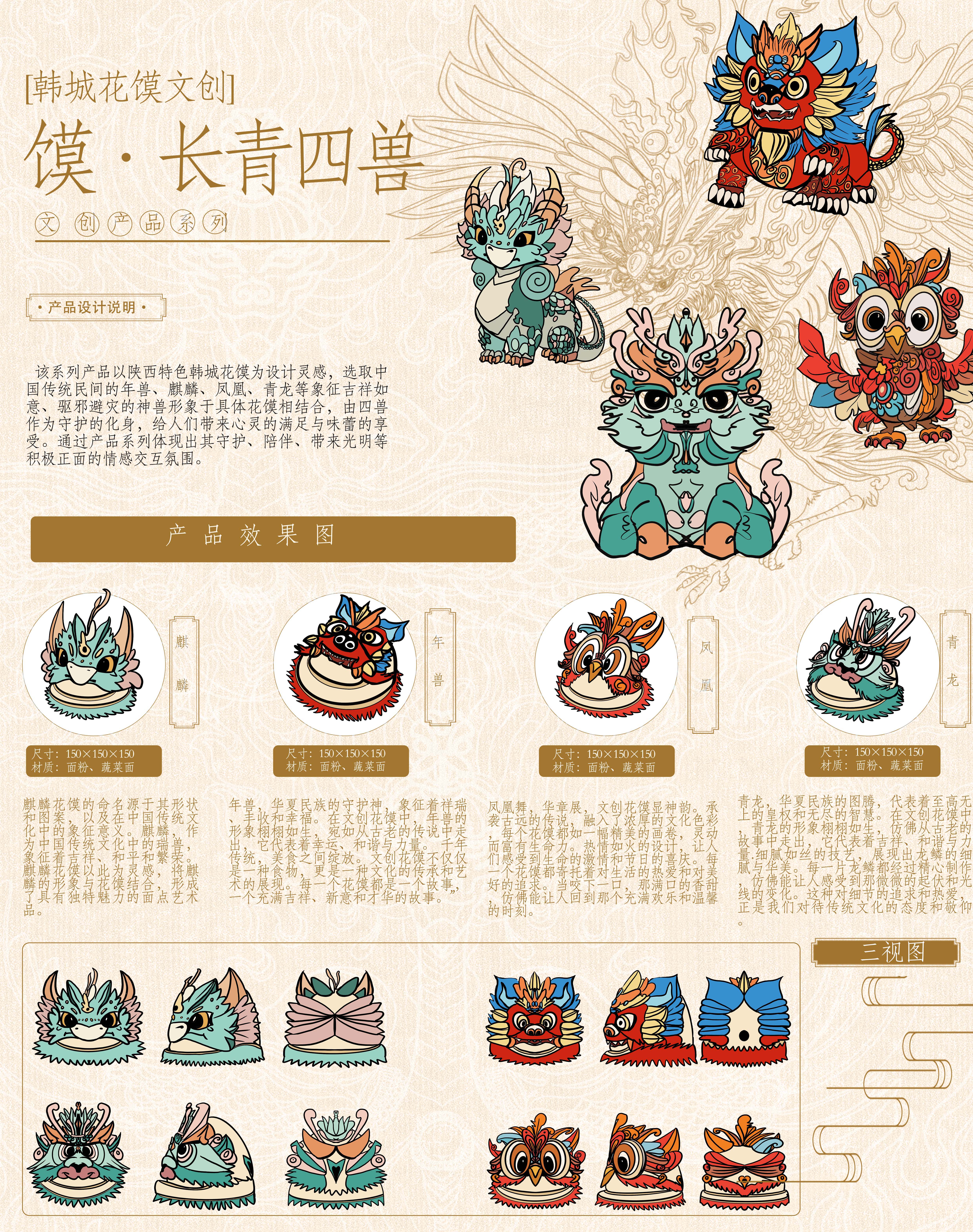该系列产品以陕西特色韩城花馍为设计灵感,选取中国传统民间的年兽、麒麟、凤凰、青龙等象征吉祥如意、驱邪避灾的神兽形象于具体花馍相结合,由四兽作为守护的化身,给人们带来心灵的满足与味蕾的享受。通过产品系列体现出其守护、陪伴、带来光明等积极正面的情感交互氛围。