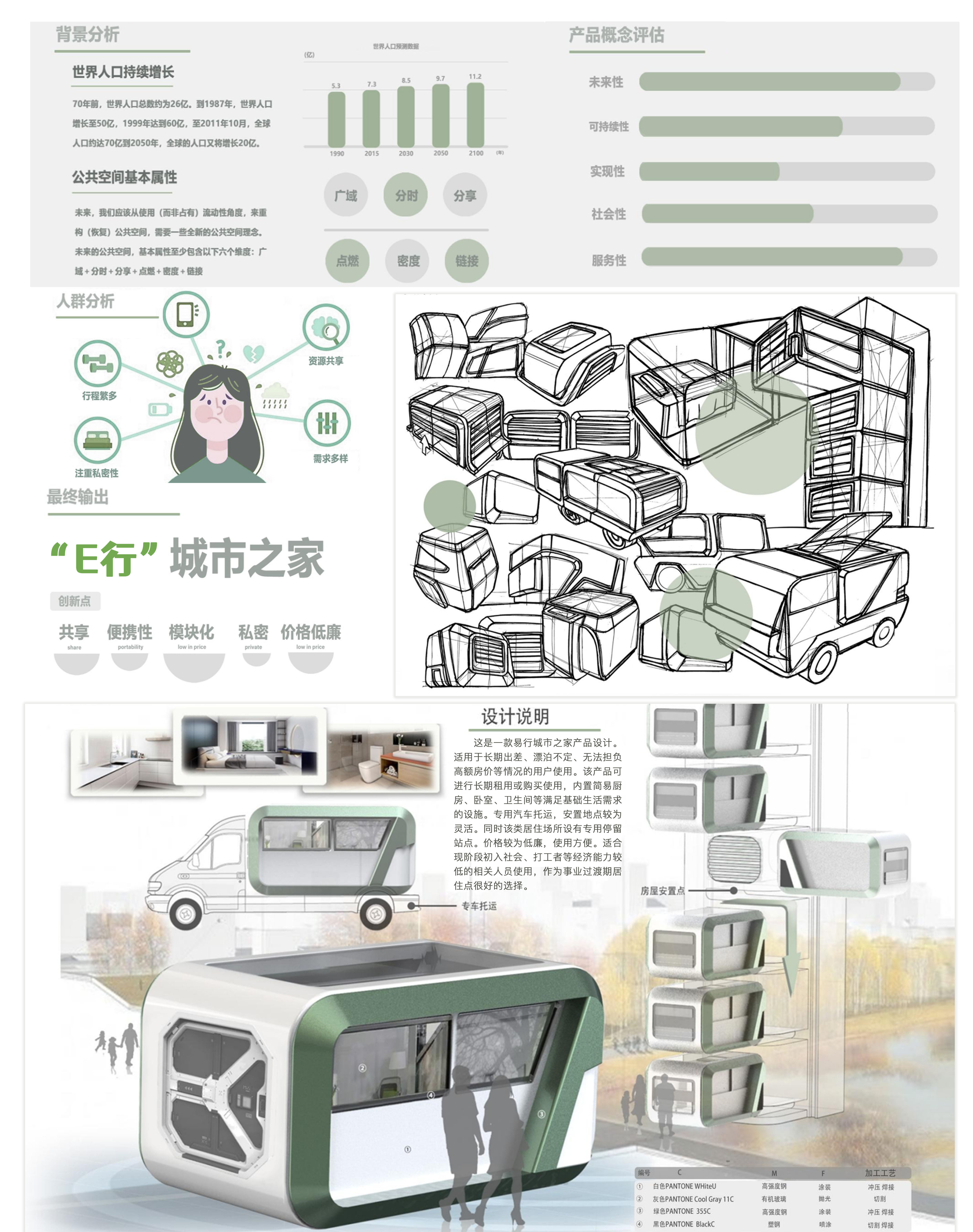 这是一款易行城市之家产品设计。适用于长期出差、漂泊不定、无法担负高额房价等情况的用户使用。该产品可进行长期租用或购买使用,内置简易厨房、卧室、卫生间等满足基础生活需求的设施。专用汽车托运,出行方便,安置地点灵活。同时该类居住场所设有专用停留站点。价格较为低廉,使用方便。适合现阶段初入社会、打工者等经济能力较低的相关人员使用,作为事业过渡期居住点很好的选择。