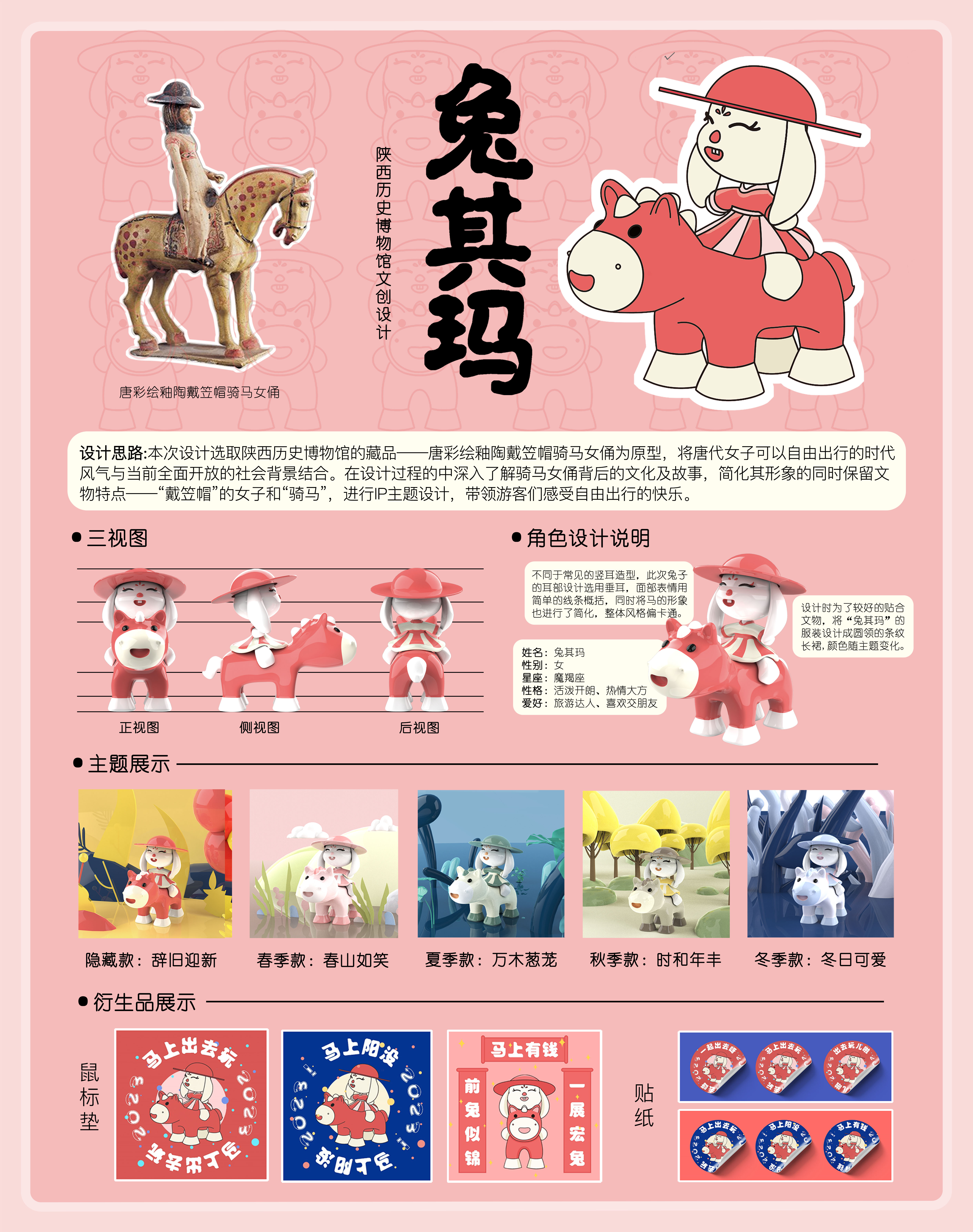 本次设计选取陕西历史博物馆的藏品——唐彩绘釉陶戴笠帽骑马女俑为原型,将唐代女子可以自由出行的时代风气与当前全面开放的社会背景结合。在设计过程的中深入了解骑马女俑背后的文化及故事,简化其形象的同时保留文物特点——“戴笠帽”的女子和“骑马”,进行博物馆IP主题设计,带领游客们感受自由出行的快乐。