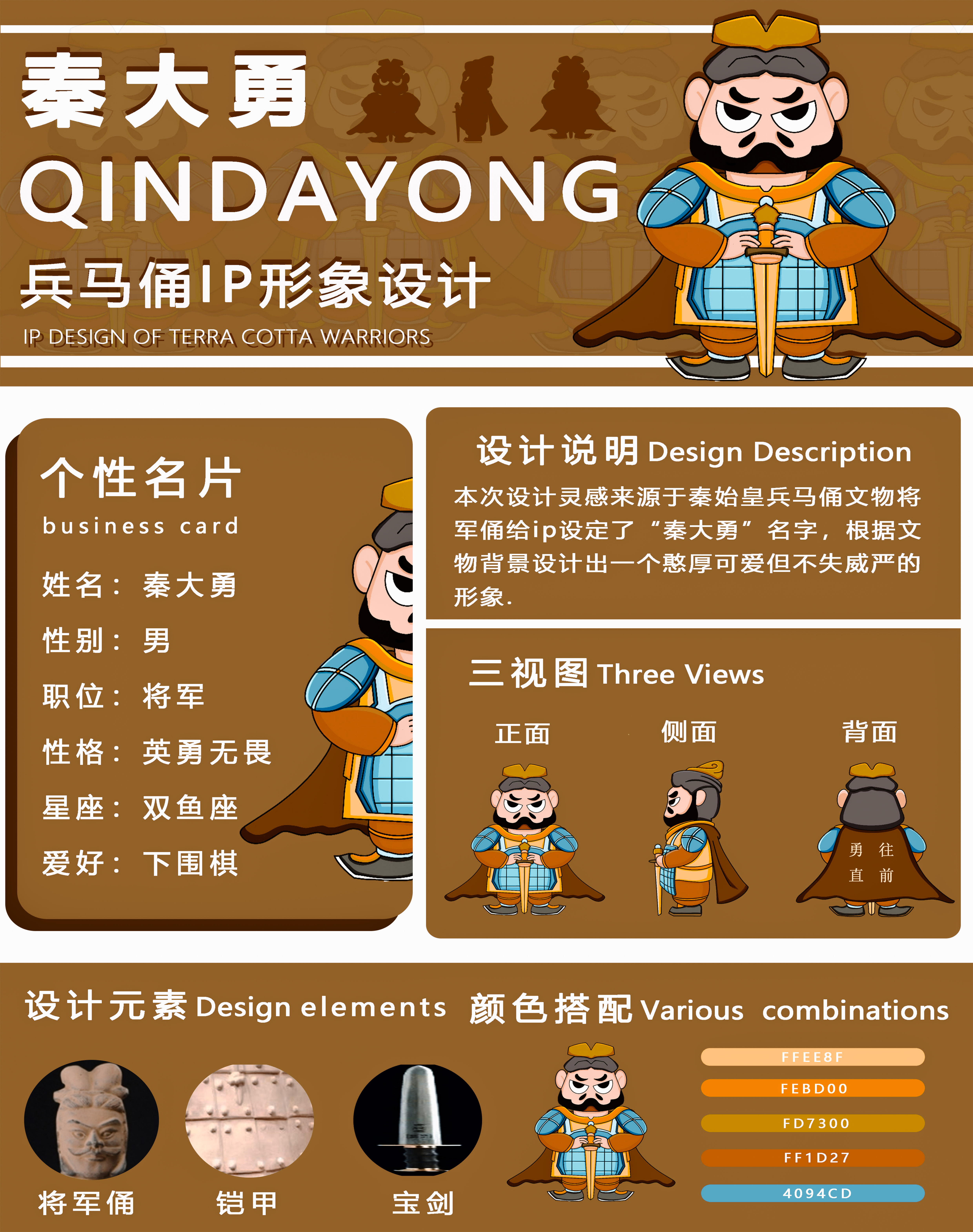 本次设计灵感来源于秦始皇兵马俑文物将军俑给ip设定了“秦大勇”名字,根据文物背景设计出一个憨厚可爱但不失威严的将军ip形象。