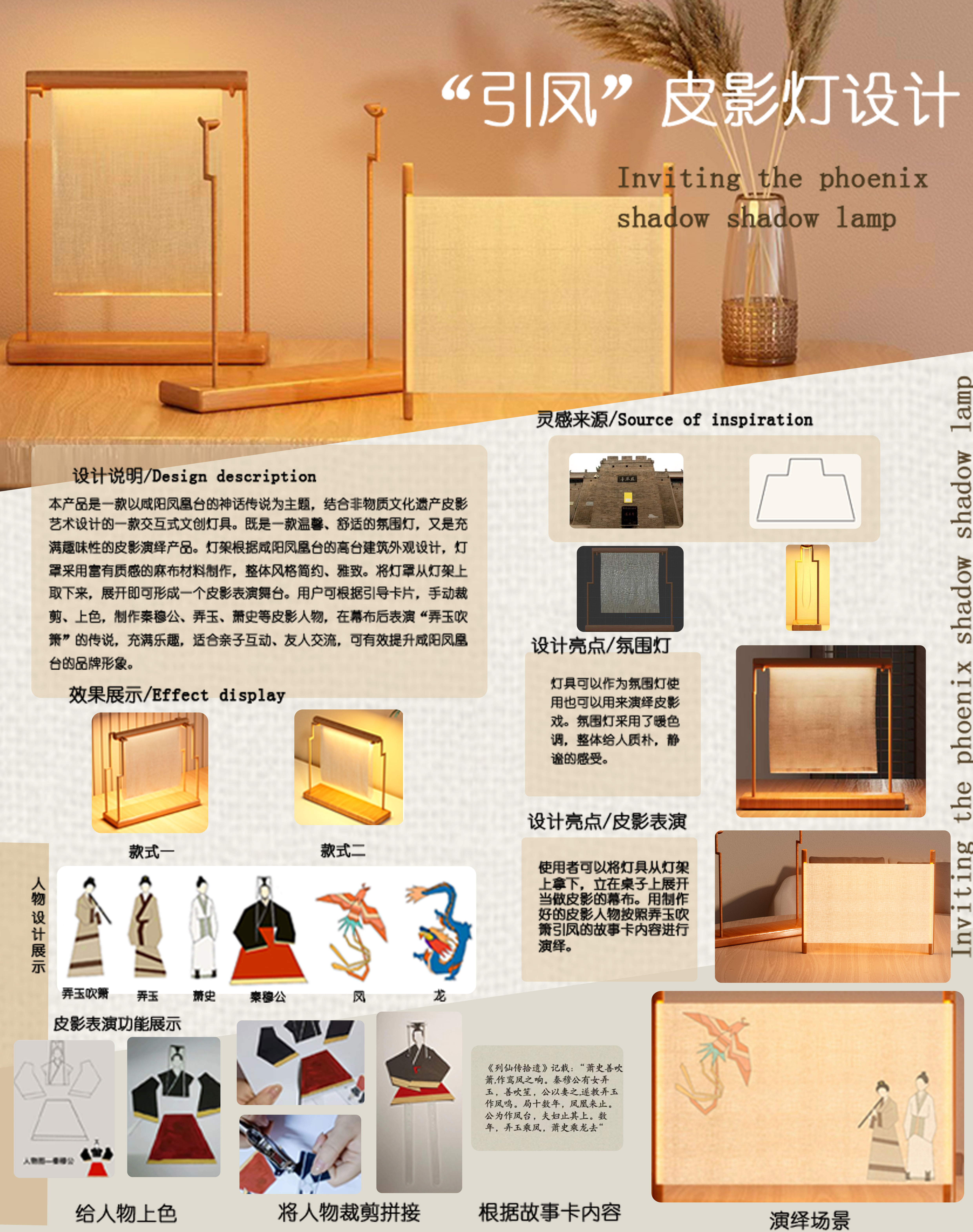本产品以咸阳凤凰台神话传说为主题,结合非物质文化遗产皮影设计的一款交互文创灯具。既是一款温馨的氛围灯,又是皮影演绎产品。灯架根据咸阳凤凰台高台建筑外观设计,灯罩采用麻布材料制作,整体风格简约、雅致。将灯罩从灯架上取下展开,即可形成一个皮影表演舞台。用户可根据引导卡片,手动裁剪、上色,制作秦穆公、弄玉等皮影人物,在幕布后表演“弄玉吹萧”的传说。适合亲子互动、友人交流,可有效提升咸阳凤凰台的品牌形象。