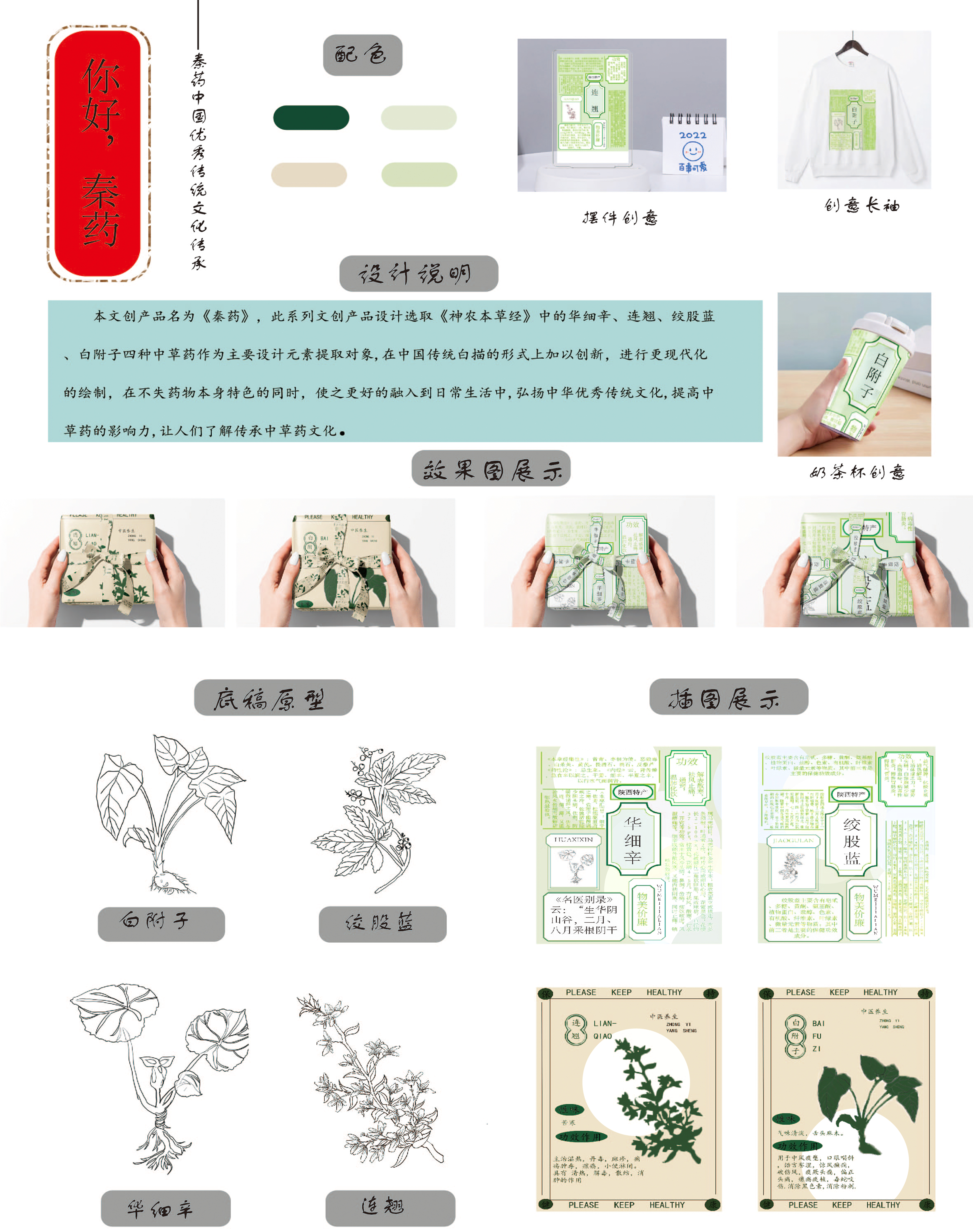 本文创产品名为《秦药》,此系列文创产品设计选取《神农本草经》中的华细辛、连翘、绞股蓝白附子四种中草药作为主要设计元素提取对象,在中国传统白描的形式上加以创新,进行更现代化的绘制,在不失药物本身特色的同时,使之更好的融入到日常生活中,弘扬中华优秀传统文化,提高中草药的影响力,让人们了解传承中草药文化。