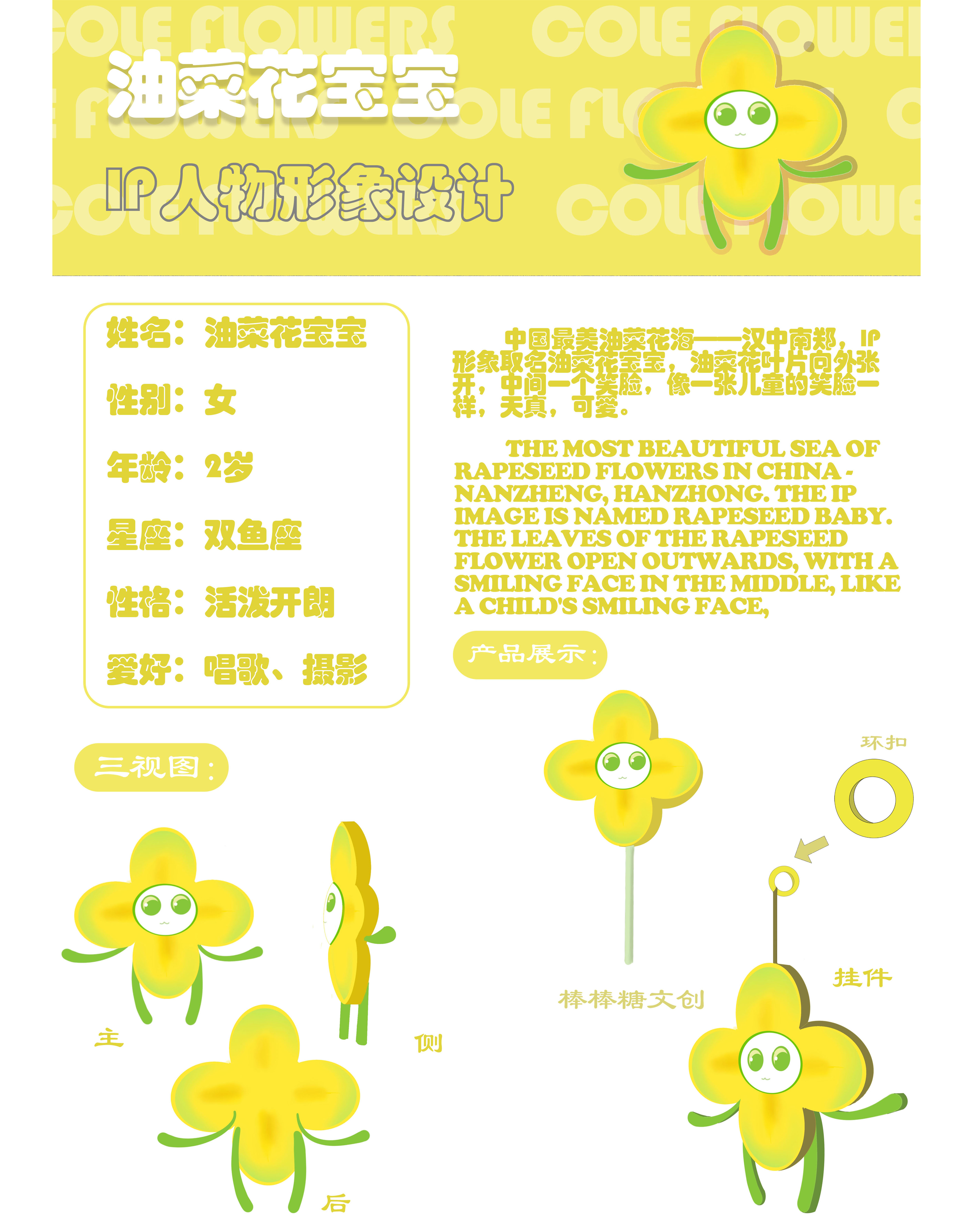 汉中盆地是油菜花的故乡,油菜花的天堂。每年花开时节,犹如一片黄色海洋。百万亩同时怒放,天地之间,浮光跃金直把汉中装缀成一只巨大的山水盆景,是中国最秀美的山水风光之一。中国最美油菜花海——汉中南郑,IP形象取名油菜花宝宝,油菜花叶片向外张开,中间一个笑脸,像一张儿童的笑脸一样,天真,可爱。