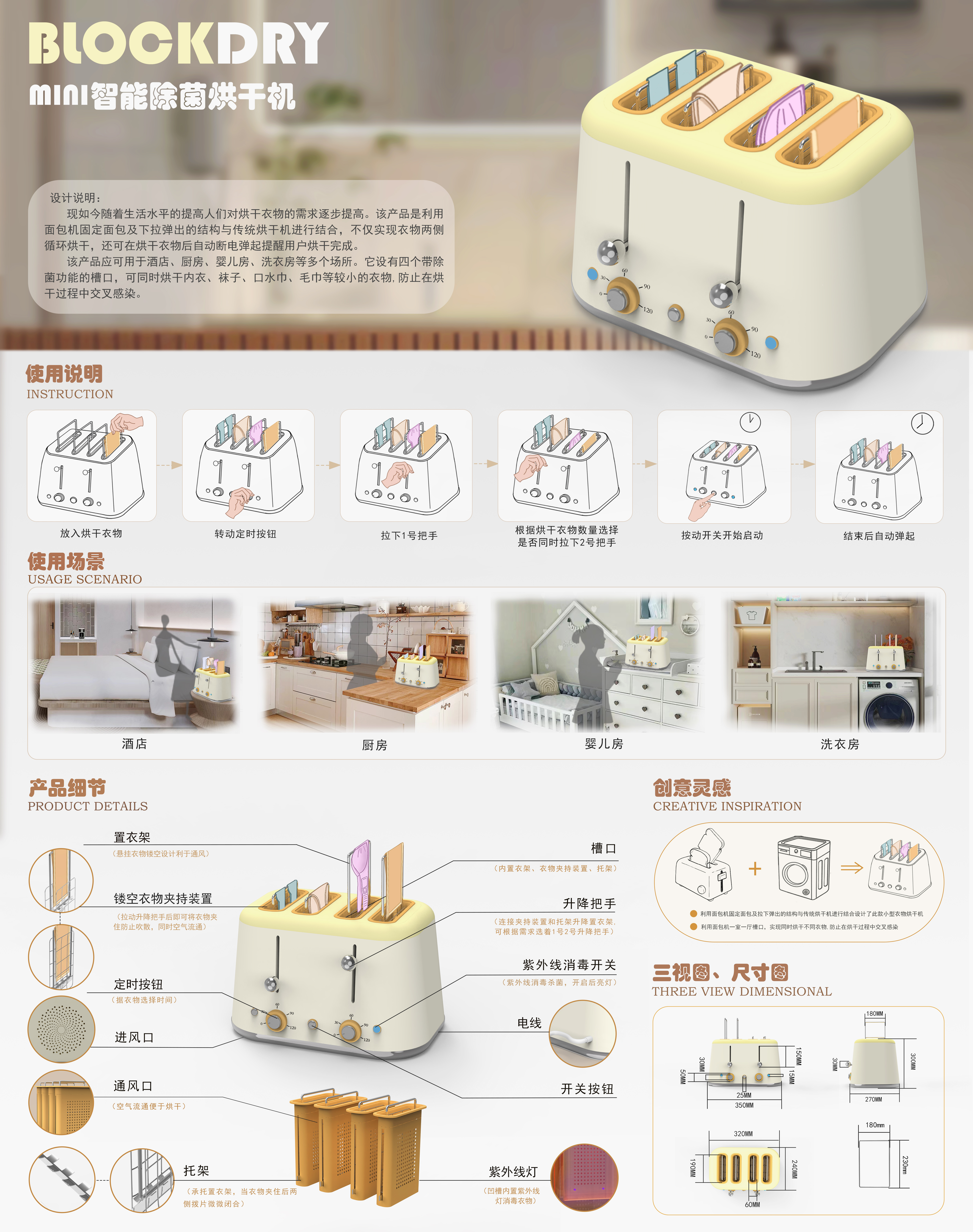 现如今随着生活水平的提高人们对烘干衣物的需求逐步提高。该产品是利用面包机固定面包及下拉弹出的结构与传统烘干机进行结合,不仅实现衣物两侧循环烘干,还可在烘干衣物后自动断电弹起提醒用户烘干完成。该产品应可用于酒店、厨房、婴儿房、洗衣房等多个场所。它设有四个带除菌功能的槽口,可同时烘干内衣、袜子、口水巾、毛巾等较小的衣物,防止在烘干过程中交叉感染。