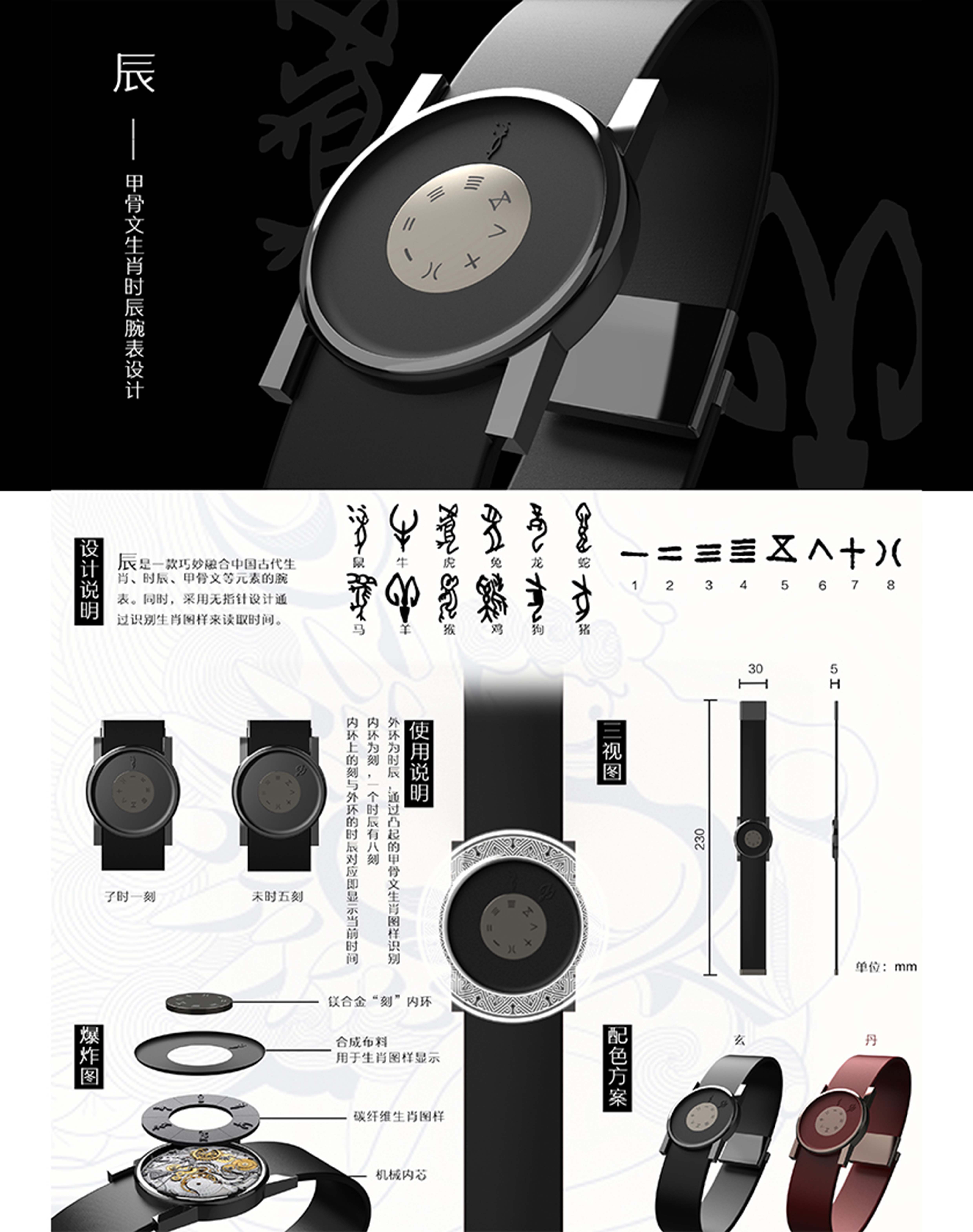 甲骨文生肖时辰腕表的设计灵感来源于中国传统文化中的生肖、时辰和甲骨文。其打破了传统指针样式,采用凸起的生肖图样来显示时辰,使腕表更富有艺术性和文化内涵。同时,通过与内环的八个刻度对应来显示时间,以提供更直观的时间信息。