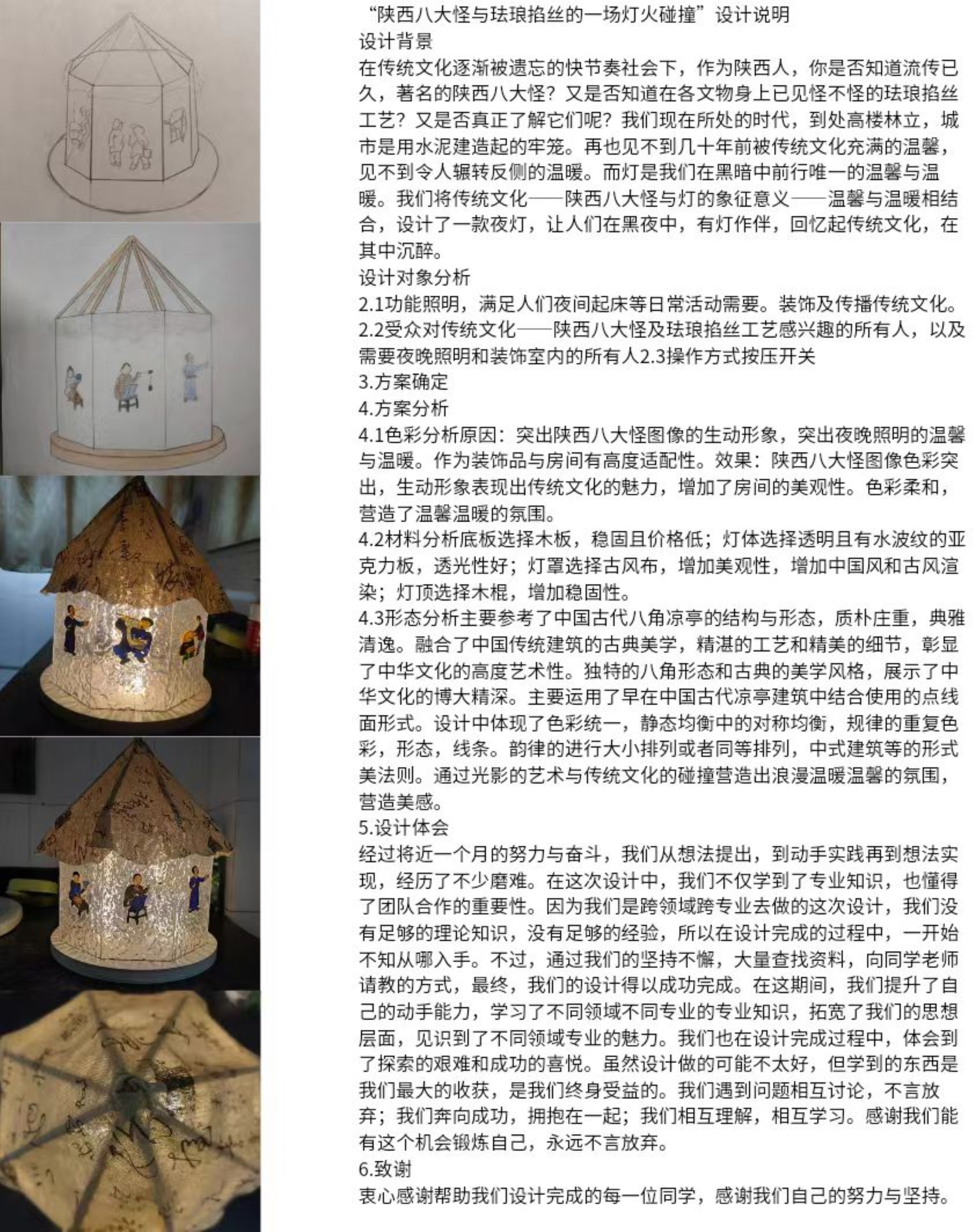 在传统文化逐渐被遗忘的快节奏社会下,著名的陕西八大怪逐渐被人遗忘,压力繁重的环境下灯是我们在黑暗中前行唯一的温馨与温暖。我们将传统文化——陕西八大怪与灯的象征意义——温馨与温暖相结合,运用非遗珐琅掐丝工艺设计了一款夜灯,让人们在黑夜中,有灯作伴,回忆起传统文化,在其中沉醉。