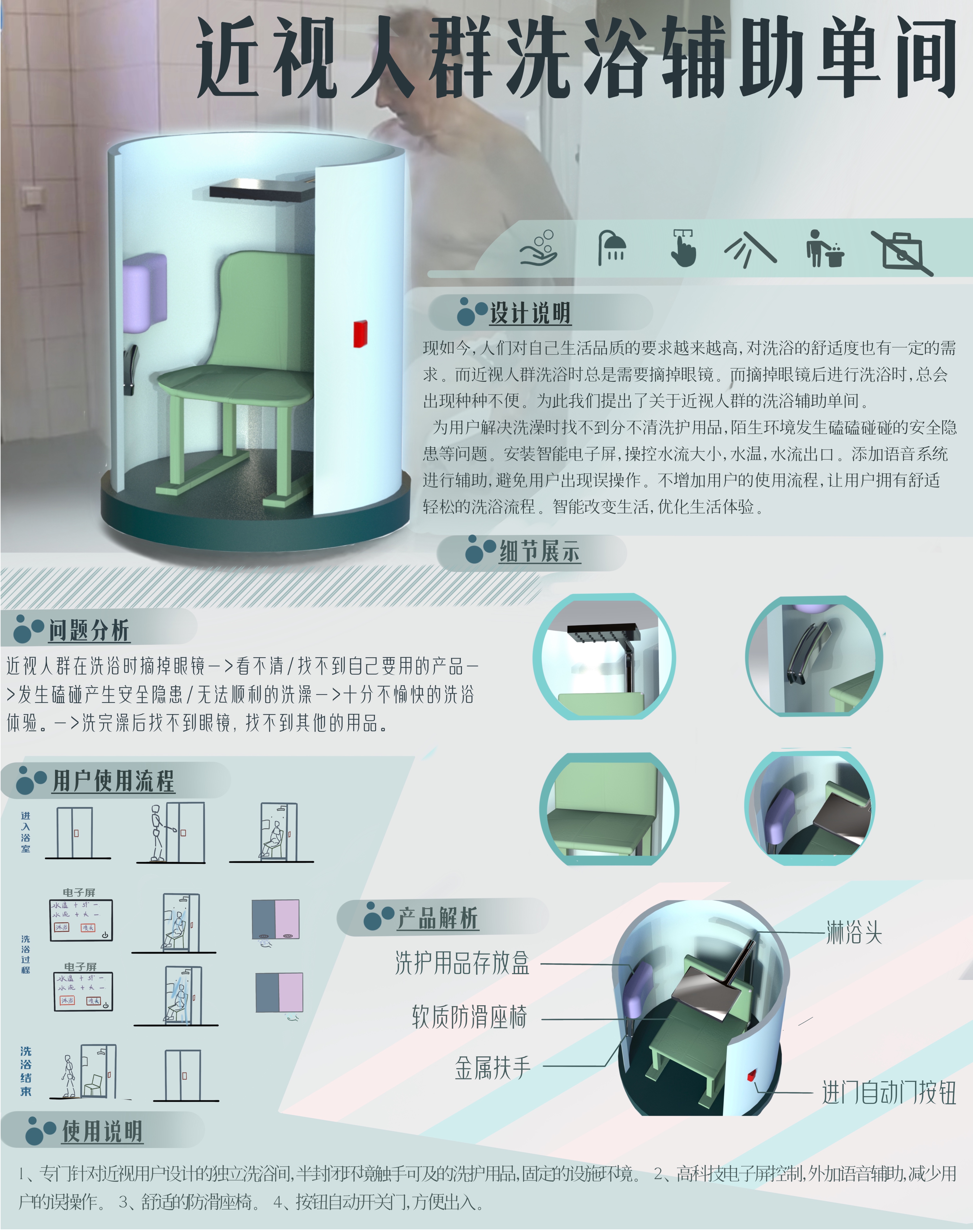 现如今,人们对自己生活品质的要求越来越高,对洗浴的舒适度也有一定需求。而近视人群洗浴时总是需要摘掉眼镜。而摘掉眼镜后进行洗浴时,总会出现种种不便。为此我们提出了关于近视人群的洗浴辅助单间。 为用户解决洗澡时找不到分不清洗护用品,陌生环境发生磕磕碰碰的安全隐患等问题。安装智能电子屏,操控水流,水温,。添加语音系统进行辅助,避免用户出现误操作。不增加用户的使用流程,让用户拥有舒适 轻松的洗浴流程。。