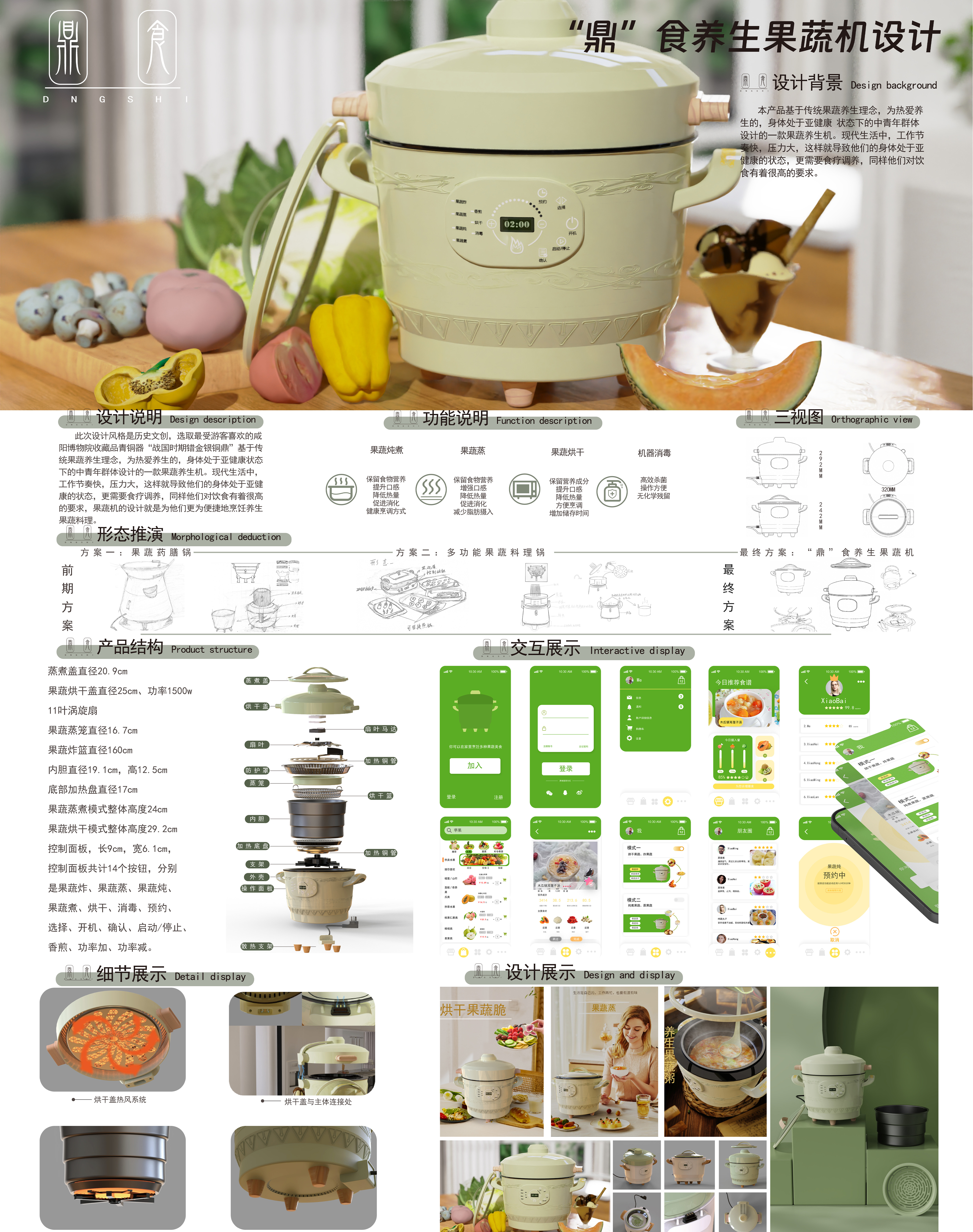 此次设计风格是历史文创,选取最受游客喜欢的咸阳博物院收藏品青铜器“战国时期错金银铜鼎”基于传统果蔬养生理念,为热爱养生的,身体处于亚健康状态下的中青年群体设计的一款果蔬养生机。现代生活中工作节奏快,压力大,这样就导致他们的身体处于亚健康的状态,更需要食疗调养,同样他们对饮食有着很高的要求,果蔬机的设计就是为他们更为便捷地烹饪养生果蔬料理。