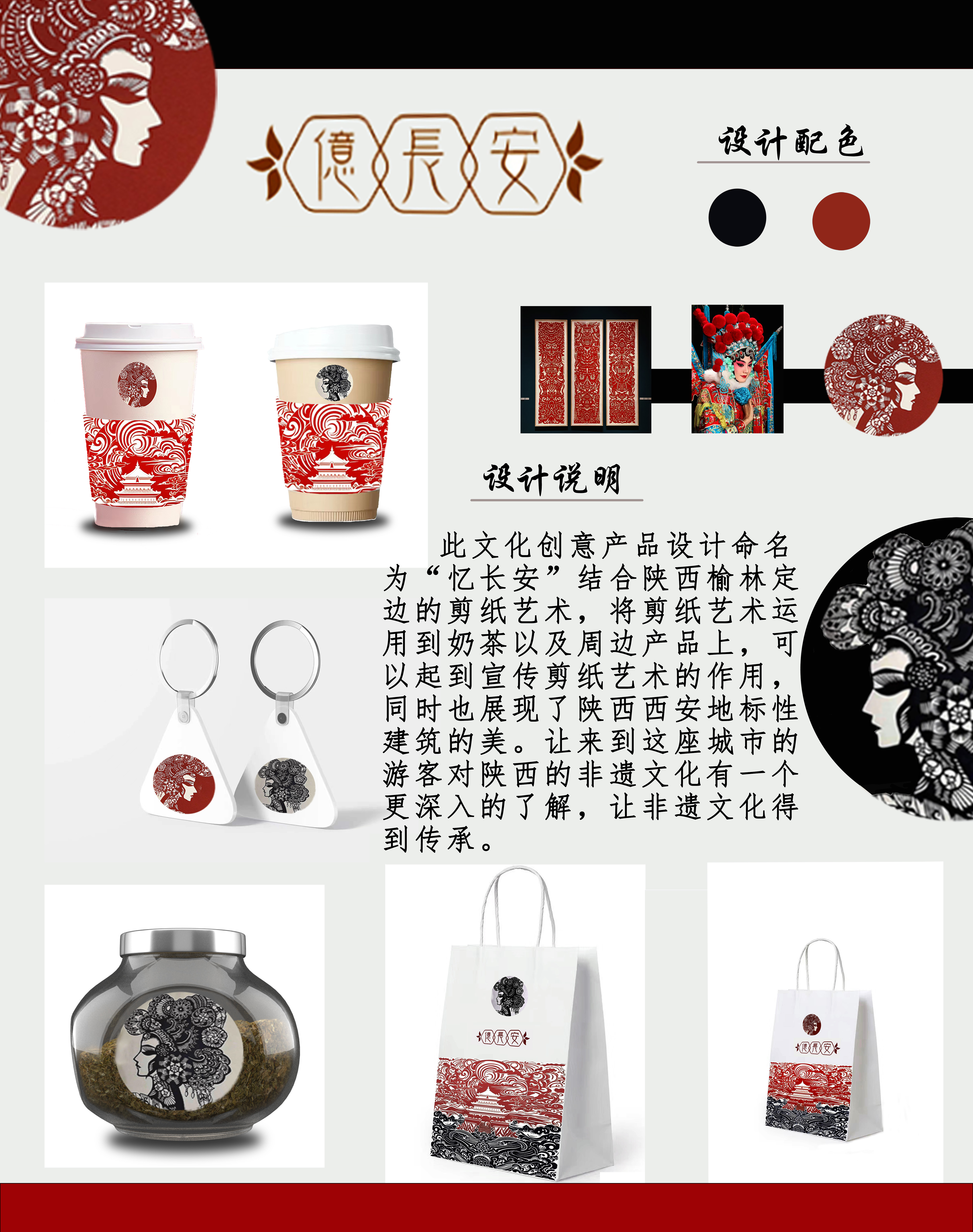 此文化创意产品设计命名为“忆长安”结合陕西榆林定边的剪纸艺术,将剪纸艺术运用到奶茶以及周边产品上,可以起到宣传剪纸艺术的作用,同时也展现了陕西西安地标性建筑的美。让来到这座城市的游客对陕西的非遗文化有一个更深入的了解,让非遗文化得到传承。