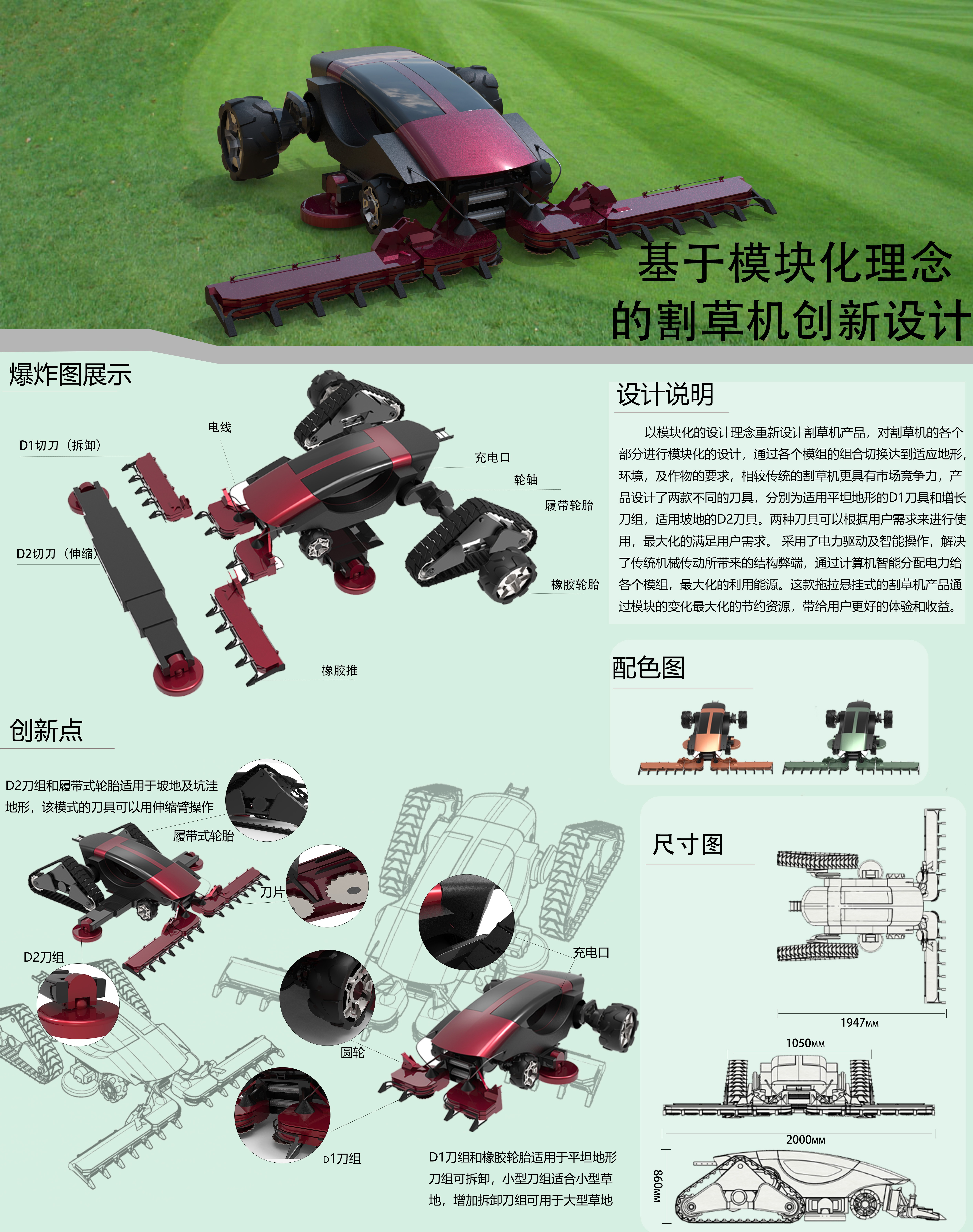 以模块化的设计理念重新设计割草机产品,对割草机进行模块化的设计,通过各个模组切换达到适应地形及作物的要求,相较传统的割草机更具有市场竞争力,产品设计了两款不同的刀具,分别为适用平坦地形的D1刀具和增长刀组,适用坡地的D2刀具。刀具可以根据用户需求来进行使用,满足用户需求。 采用了电力驱动及智能操作,解决了传统机械传动所带来的结构弊端,通过计算机智能分配电力给各个模组,最大化的利用能源。