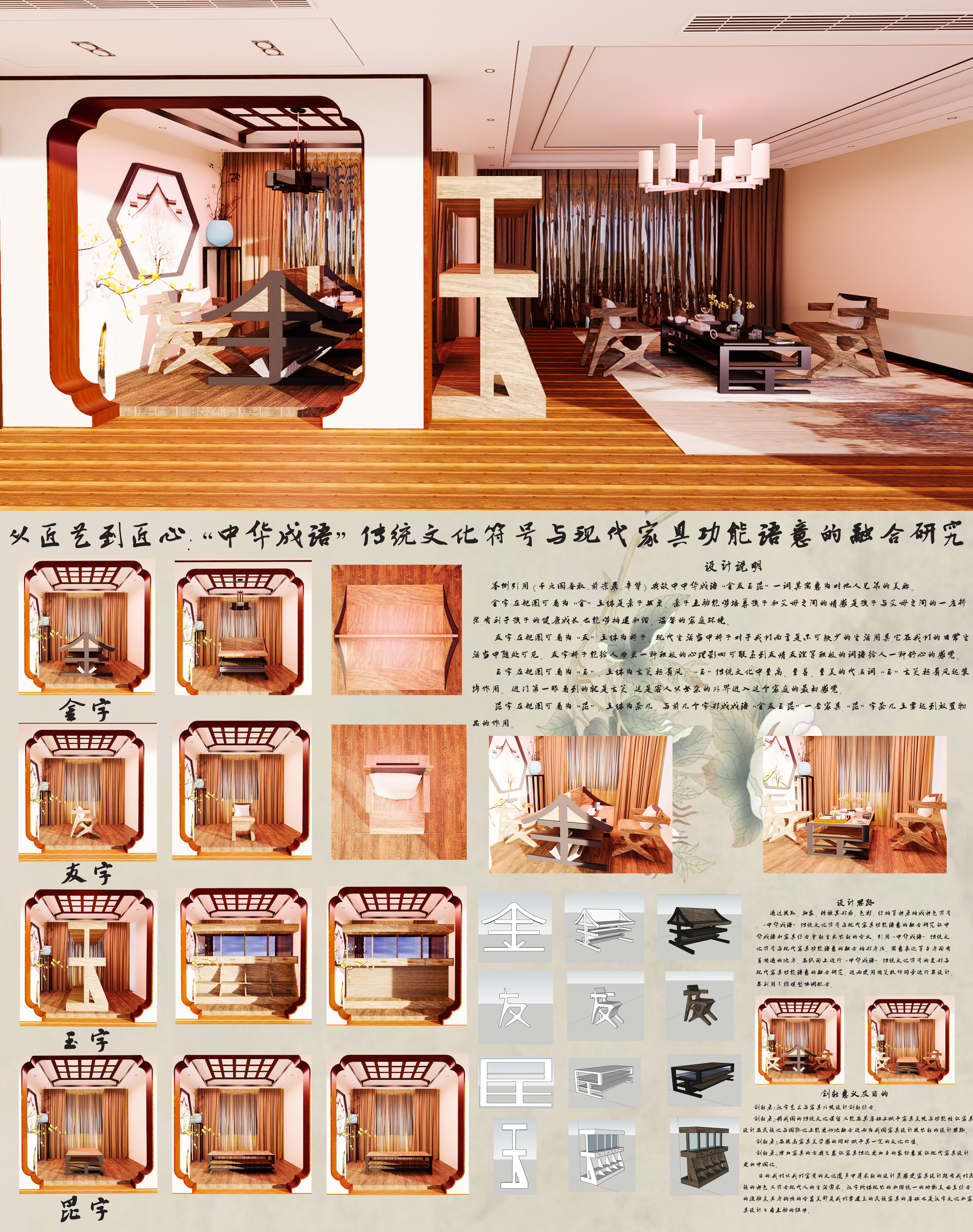 本项目中“中华成语”传统文化符号设计运用时通过提取、抽象、转换其形态、色彩、结构等特点构成特色符号,运用于现代家具设计中。摈弃传统表现形式的拼贴与装饰,而是与家具的功能语意相融合,将一个符号的外在特征和内在精神找到一个合理的连接纽带。在传统文化符号在表达的时候注重符号内涵与现代家具精神功能之间的情感传递,让人在“形似”的感官体验和直觉感知的使用过程中感悟符号所象征的文化寓意。如“金友玉昆”一词。